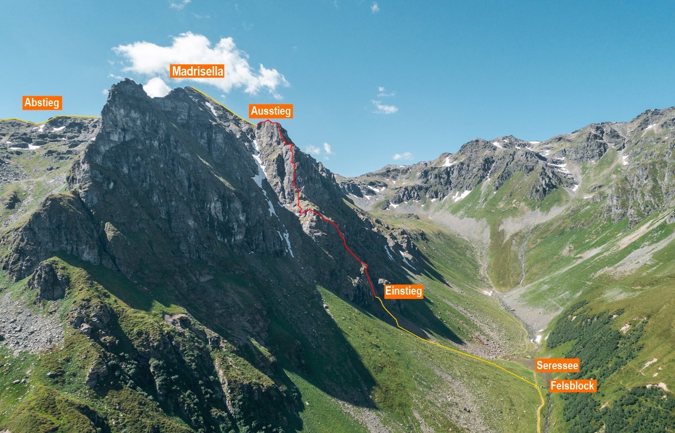 Von der Bergstation der Versettla-Bahn auf der Schotterstraße (unten kurz Pfad) zur Alpe Nova absteigen. Von der Alpe Nova taleinwärts auf die mächtige Madrisella zugehen. Beim sog. Seressee, bei einem Felsblock nach links auf den Zustiegspfad zum Klettersteig abzweigen. Zuletzt steil - besser schon vorher die Ausrüstung anlegen - hinauf zum Einstieg auf dem Vorbau.