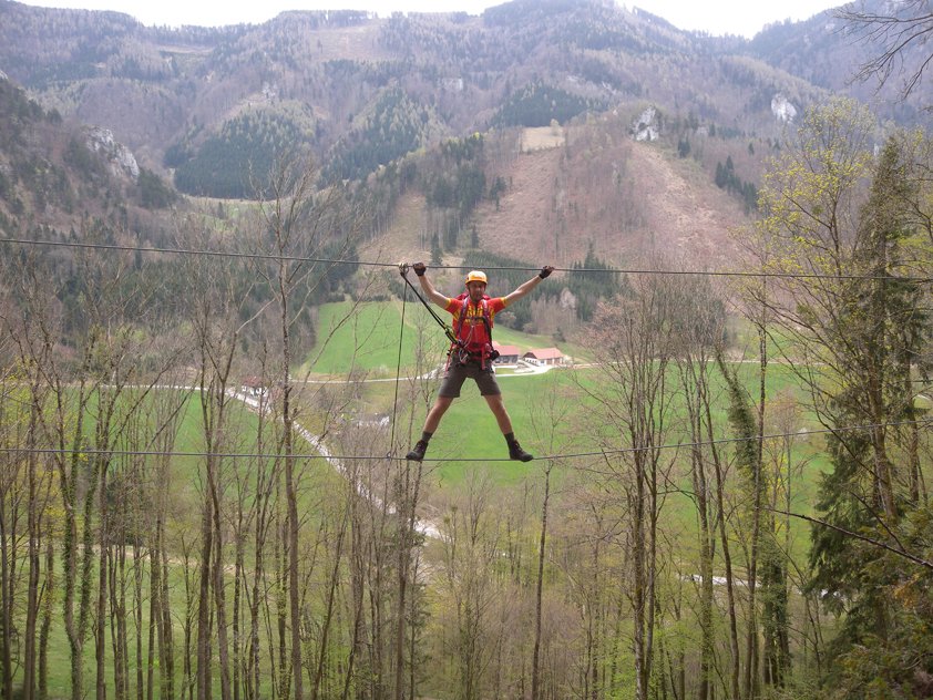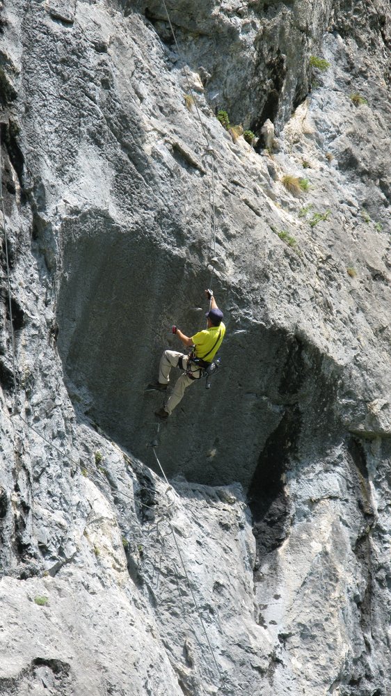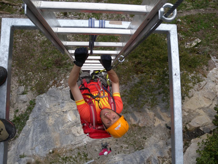 Nach dem Aufwärmen im Feitel Klettersteig (siehe Topo, das ist der beste Zustieg zum Mammut Klettersteig) beginnt der Mammut-Klettersteig mit der langen Seilbrücke (B/C), danach folgt eine Aluleiter (B), an der man auch an der überhängenden Seite hinaufklettern kann (dann E). Vom Ende der Leiter steigt man zu einem kleinen Dach (D) hinauf, welches die Schwierigkeiten (E) quasi einläutet. Danach folgt eine lange E-Passage, die sich nur unwesentlich abschwächt, gegen oben hin wird es mit D etwas leichter, sodass man realistische Chancen hat, auch das Ende zu erreichen.