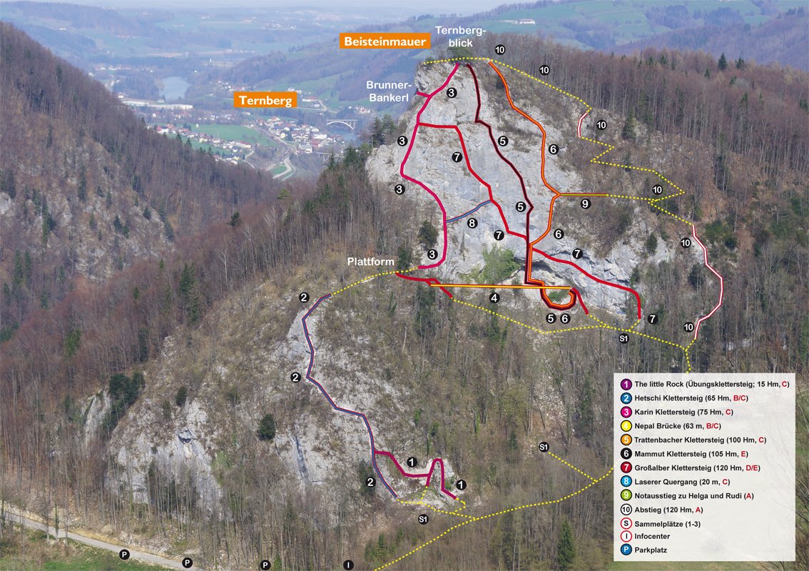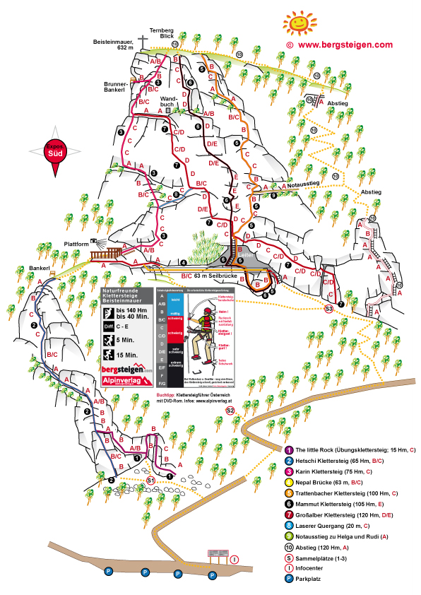 Die Felswand wurde im wahrsten Sinne des Wortes systematisch mit Klettersteigen überzogen. Die Infotafel zeigt gleich was ab geht, vom Übungsklettersteig „The little Rock“ (Stelle C) bis zur megaschweren „Mammut-Route“ (solide und recht anhaltend E) reicht die Auswahl. Die sogenannte „Mammut Route“ (E), gesponsert vom gleichnamigen Bergsporthersteller, der in der Nähe seine Österreichzentrale hat, ist der schwerste Klettersteig an der Beisteinmauer - vor allem Aussdauer und viel Kraft sind nötig, um die lange, immer leicht überhängende E-Passage zu bewältigen.