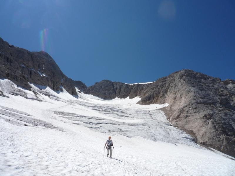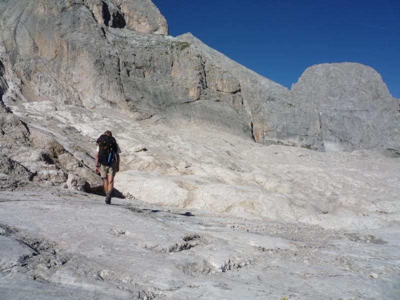 Von Tal zum ehemaligen Rifugio Pian dei Fiacconi (2626 m) , dort auf dem Weg 606 in westlicher Richtung 150 Hm absteigend um einen Felssporn herum. Anschließend im Gletschergeröll und Schutt zum Vernel-Gletscher aufsteigen, über diesen zu den ersten Versicherungen unter einer Scharte (bei wenig Schnee ist der Gletscher heikel!). Alternativer Zustieg ist auch vom Rif. Contrin (2016 m) über den Weg 606 möglich.
