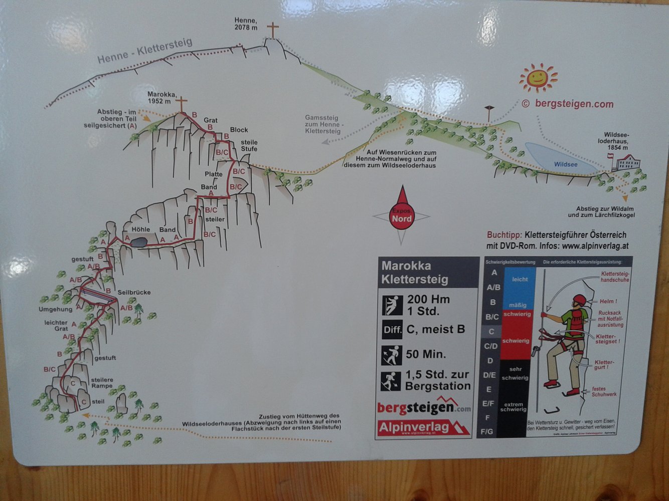 Man kann nach dem Marokka Klettersteig auch den Henne-Klettersteig anhängen. Vom Wiesenrücken führt ein Gamssteig unter den Nordabbrüchen der Henne zum Einstieg bei der Bergstation des Sesselliftes (vom Marokka Gipfel ist der Steig gut sichtbar).