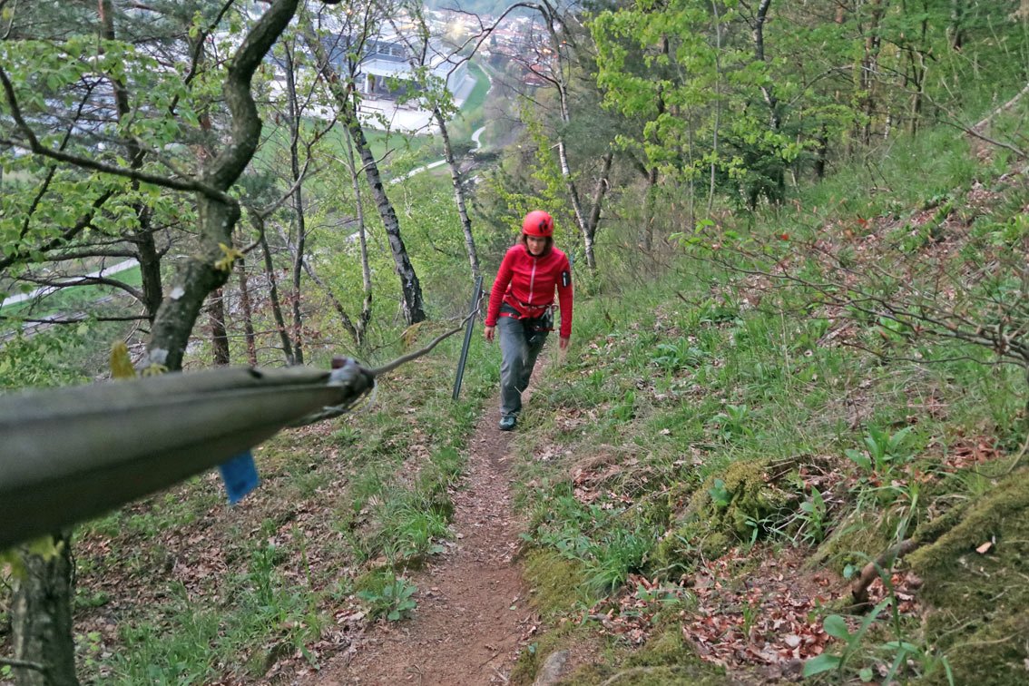 Siehe Topo. Über eine Stufe (A) hinauf auf ein Band. Rechte Variante: Hinauf zur Leiter (A/B) und über die Doppelleiter (A und A/B, zwischen den Leitern kurz B) aufwärts. Nach der zweiten Leiter kommt eine kurze Stufe (B/C), danach gestuft hinauf zum Kreuz (A/B, Steigbuch). Vom Kreuz links (A) hinunter (B) zu einer Platte (B/C). Nach der Platte (ab dort gemeinsam mit der linken Variante) über eine Stufe (B und B/C) hinauf und auf einem gestufen Band (A/B) zum Ende der Felswand. An einem Zaunseil (gehen) nach rechts, bis dieses aufhört (Beginn des Abstiegspfades).