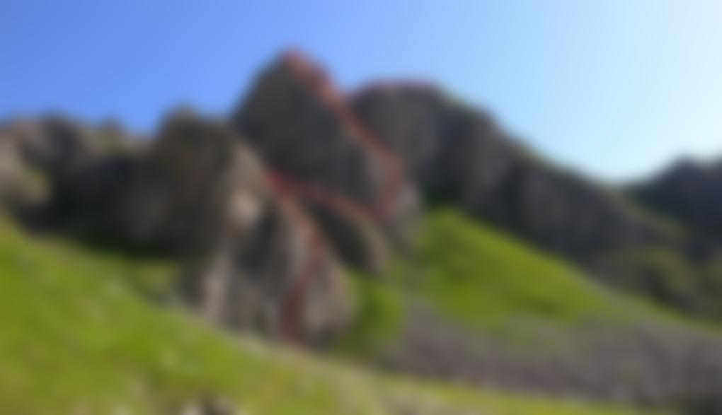 Vom Einstieg über steiles Gelände (C) hinauf in Schrofen (B) bis zur Seilbrücke (B). Nach der Seilbrücke kommt wieder eine steile Passage (C), das Gelände wird aber gegen oben hin leichter (B). Am Ende auf dem Grat (kurz B, sonst A) zum Gipfelkreuz.