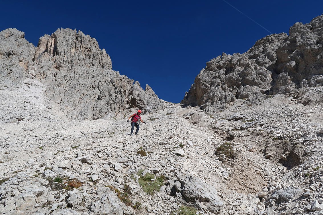 Vor allem im oberen Teil ist beim Aufstieg zur Forcella de Ambata auf Steinschlag zu achten.