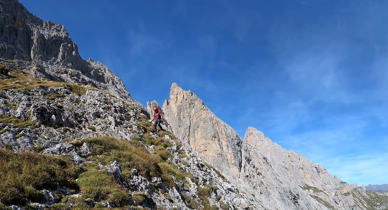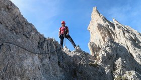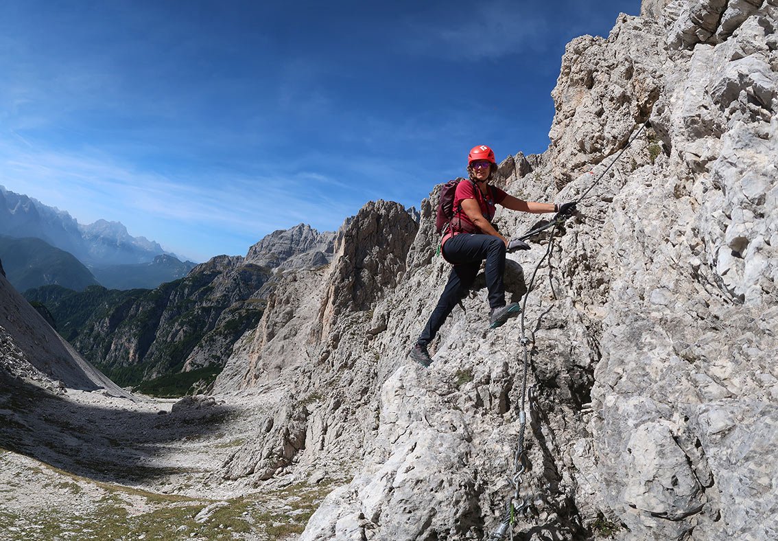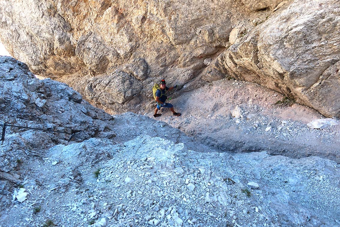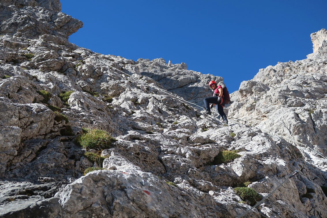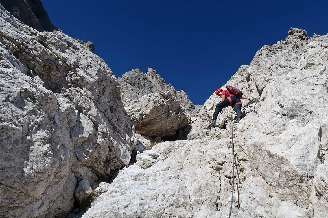 Gut mit Stahlseil und wenigen Trittklammern gesichert, es gibt aber beim Aufstieg zur Forcella de Ambata auch ungesicherte Kletterstellen!