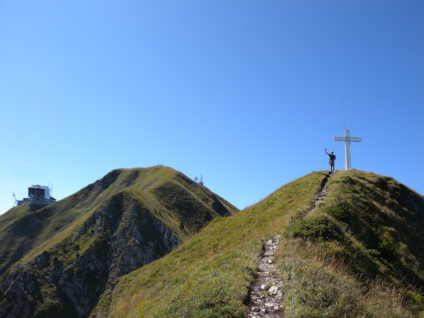 Vom Ausstieg auf dem Vorgipfel dem Grat (stellenweise versichert) zum Hauptgipfel des Moléson folgen und weiter zur Bergstation der Luftseilbahn. Dort entweder mit der Seilbahn hinunterschweben oder auf dem markierten Wanderweg über den Westhang (Bonne Fontaine) zur Station Plan-Francey absteigen (1 Std.).