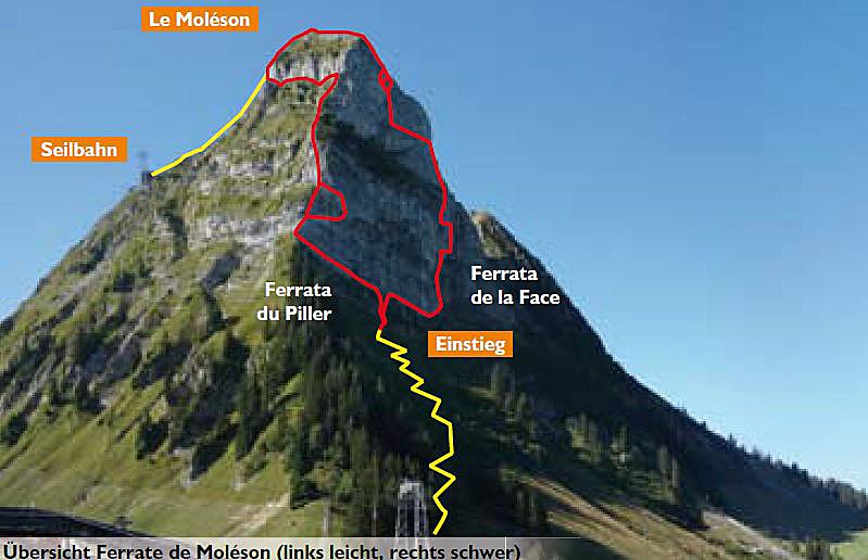 Vom Gipfel des „Voralpen-Balkons“ Moléson und Hausberg des Städtchens Gruyères mit seinem Weltberühmten Hartkäse hat man einen einzigartigen Blick über die welsche Schweiz bis zu den Berner Alpen und vom Montblanc bis zu der Drei-Seen-Region. Durch die 230 m hohe Nordwand führen zwei kurze Klettersteige, Via ferrata du Piller und die Via ferrata de la Face. Der Moléson ist ein Paradebeispiel für die schweizer Geschäftstüchtigkeit. Man muss für den Klettersteig eine Eintrittskarte (Erwachsene 4,- , Kinder 2,- sFr.) lösen und an der Plan-Francey wird jedem Großstadttouristen im Rahmen der Ferratapauschale (Materialmiete, Bergbahnen, …) ein Klettersteigset ausgehändigt.
