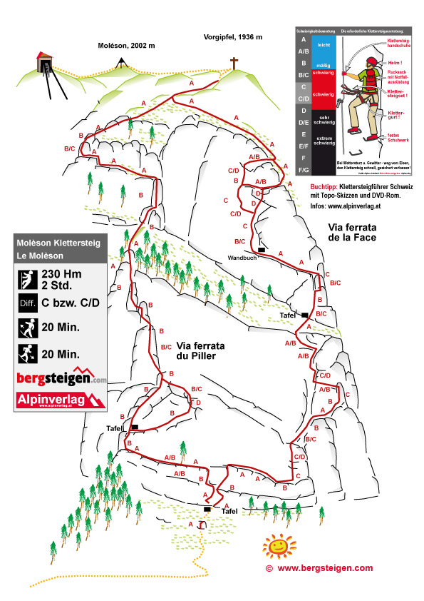 Die hier beschriebene Via Ferrata du Piller, ist der leichtere Anstieg. Sie hat aber nach der Querung eine extrem augsetzte Variante (D). Der Klettersteig ist recht erdig und grasdurchsetzt. Man sollte ihn daher nach Regenfällen und im Frühjahr meiden.