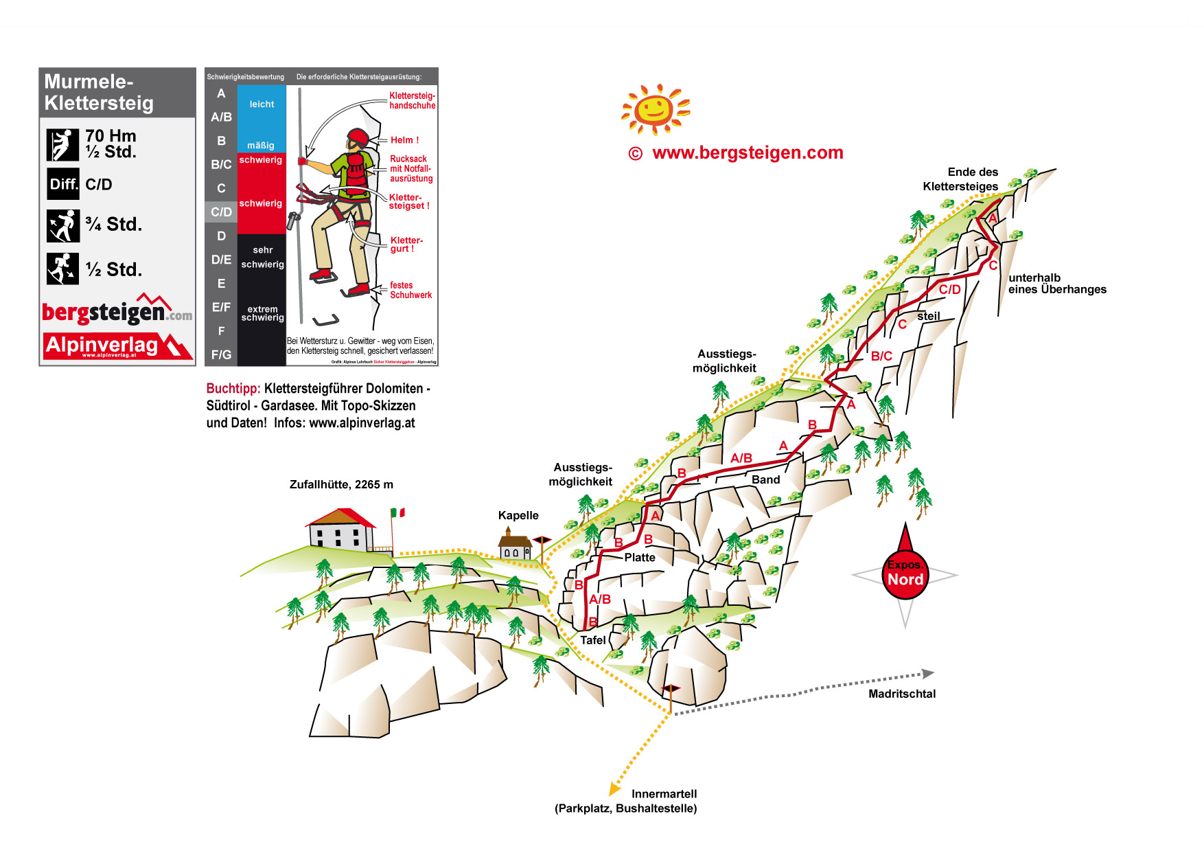 Der Murmele-Klettersteig ist ein typischer Hüttenklettersteig, der von der Zufallhütte in nur wenigen Minuten erreichbar ist. Die Route ist recht interessant und zuletzt durchaus anspruchsvoll in drei Sektionen in die meist schattige Felswand gebohrt worden. Nach jeder Sektion gibt es eine gute Rastmöglichkeit und einen Notausstieg.