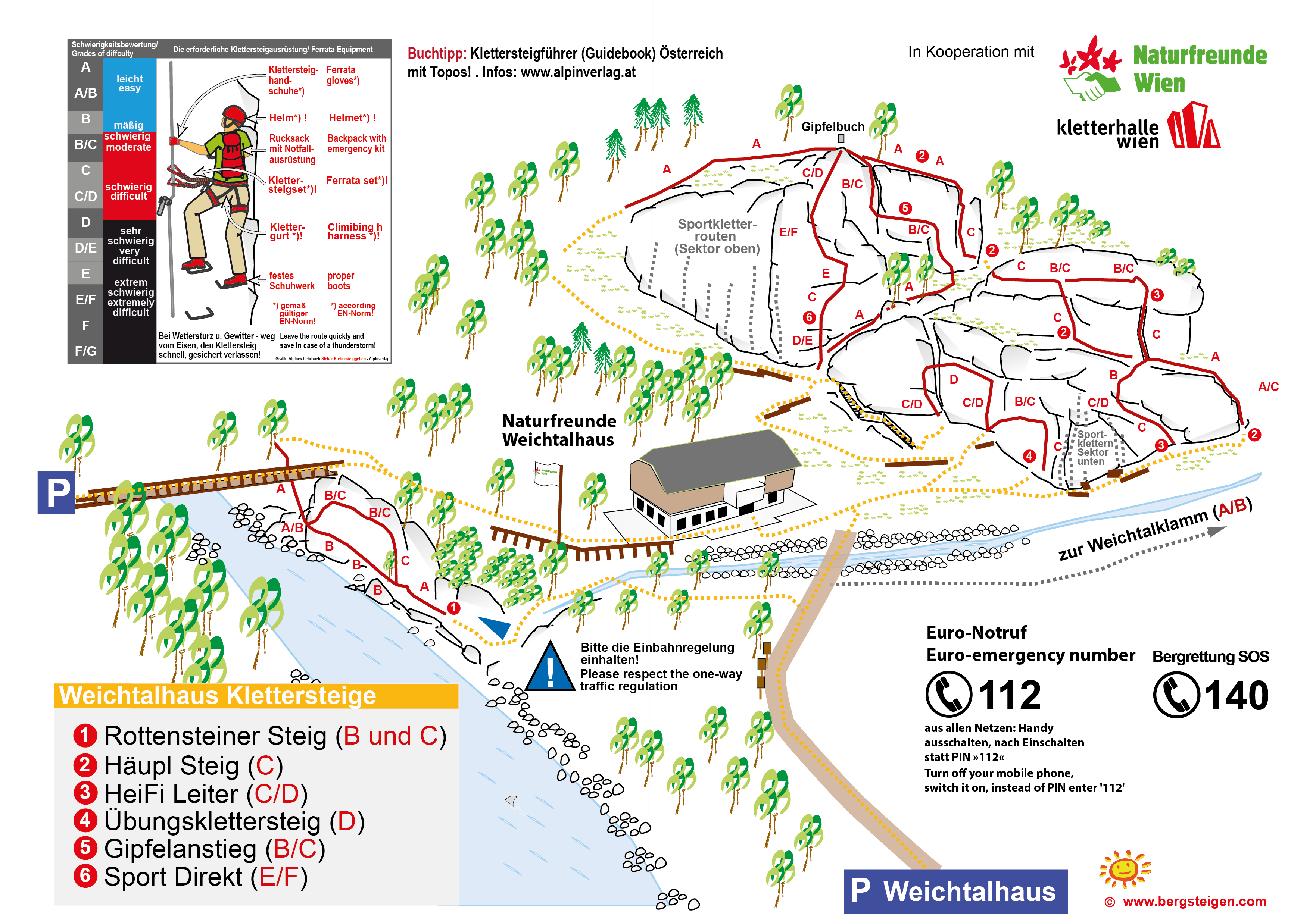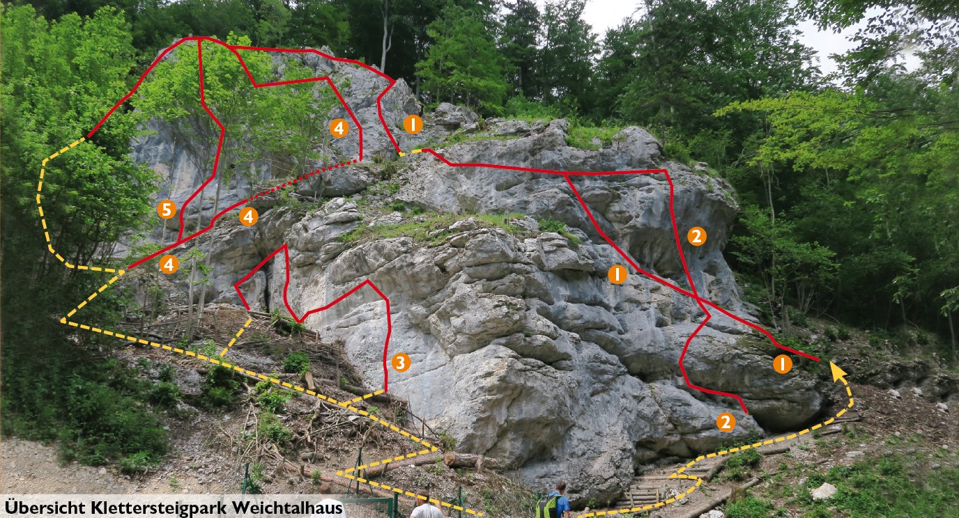 Im Zuge des Neubaus des Weichtalhauses wurde der Hüttenfelsen freigeschnitten und mit fünf Klettersteigen überzogen. Das Ganze nennt sich nun Klettersteigpark Weichtalhaus und bietet Klettersteigvergnügen im Schwierigkeitsgrad von B/C bis E/F. Die Routen sind bis zu 50 Hm lang und eignen sich optimal, um sich an höhere Schwierigkeitsgrade heranzutasten. Da sich einige Routen kreuzen, ergeben sich interessante Kombinationsmöglichkeiten.