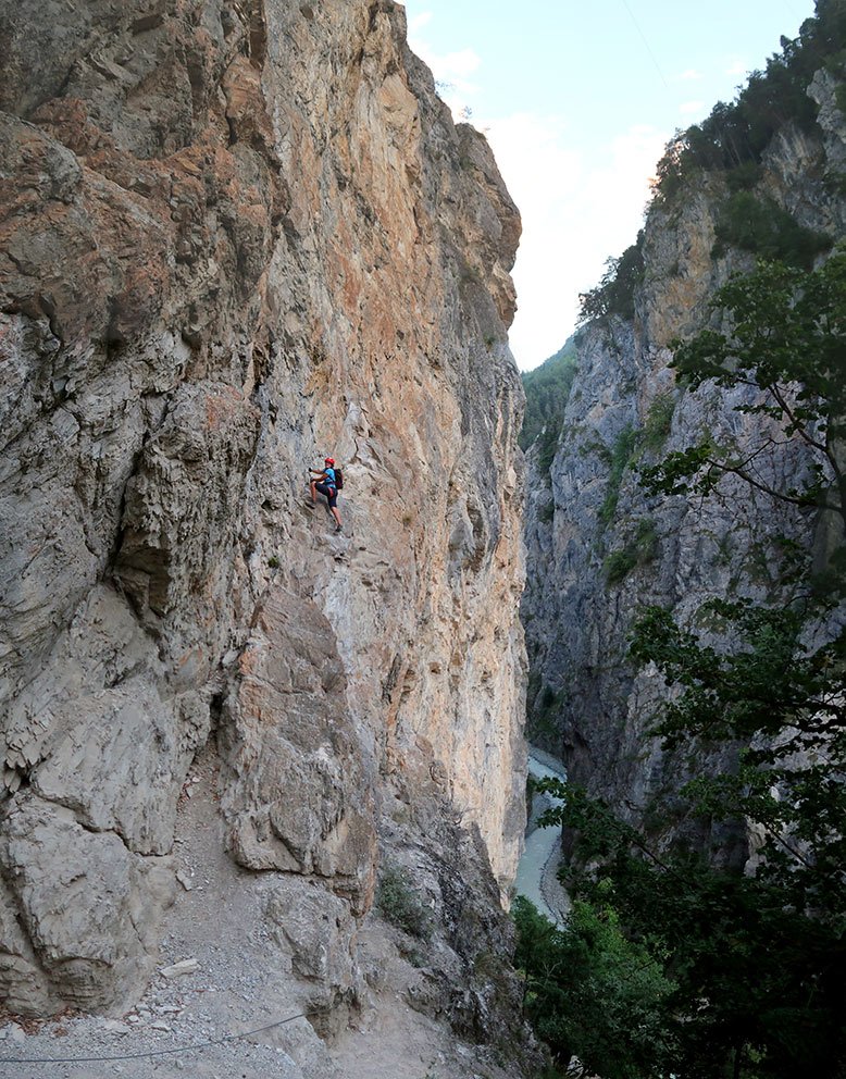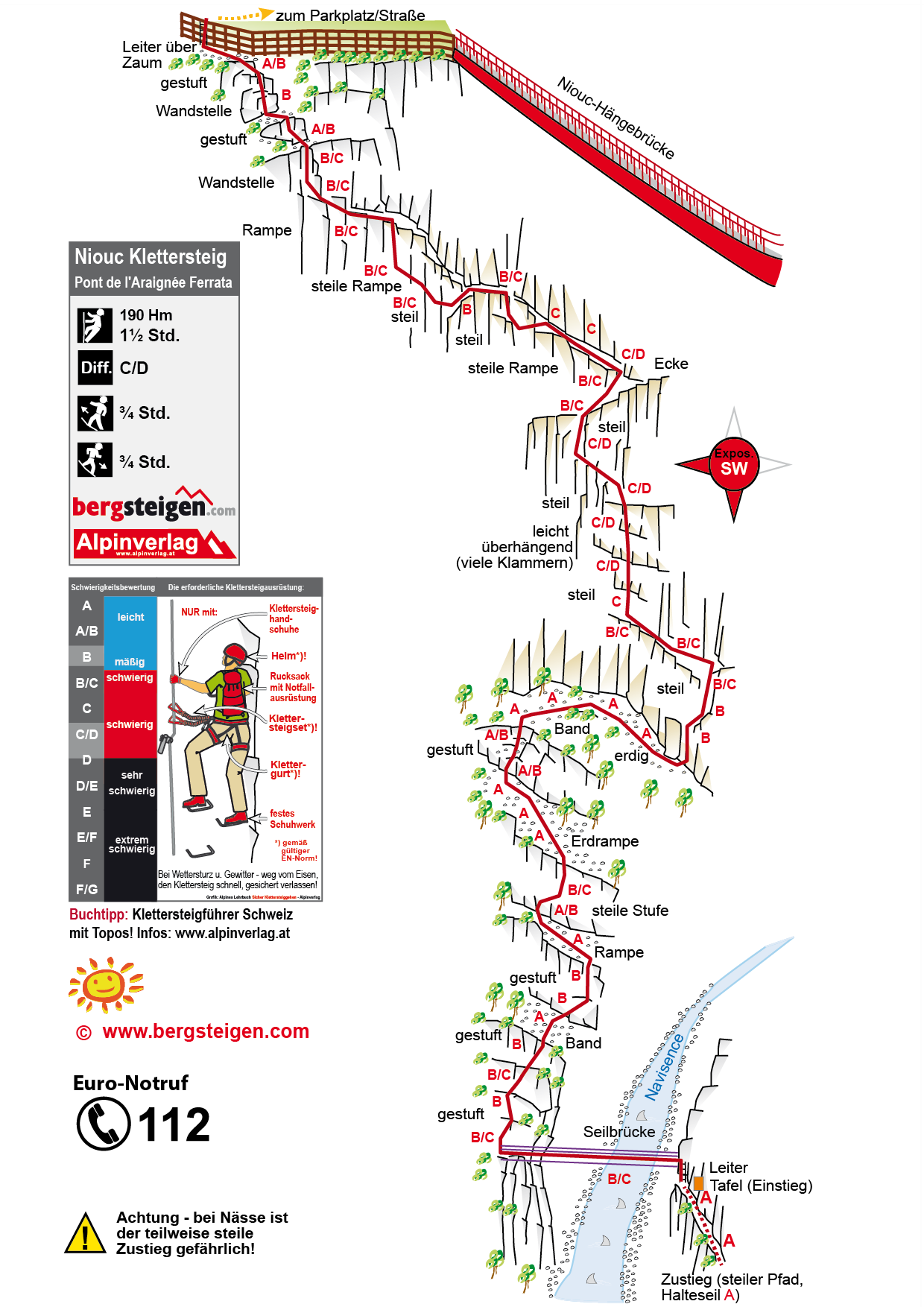 Der Niouc Klettersteig verläuft direkt unterhalb einer der höchsten Hängebrücken Europas und verläuft extrem ausgesetzt an der gelben, vertikalen Felswand aufwärts. Die Ferrata ist mit sehr vielen Klammern und eine auf weite Strecken lockerem (Französischer Stil) Stahlseil gesichert. Um so höher man klettert, um so eindrucksvoller tut sich der Blick in die tiefe Schlucht auf und man hält sich instinktiv noch etwas mehr an den Griffklammern fest. Erschrecken sollte man auch nicht, wenn ein Bungee-Jumper an einem vorbeizischt. In Kombination mit einem Gang über die historische Hängebrücke - diese wurde ehemals als Wasserleitung genutzt und war bis 1929 sogar die höchste Hängebrücke der Welt - eine gewaltige Angelegenheit.