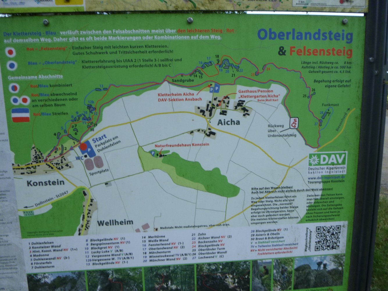 Die Kletterpassagen zu Beginn der blauen Route kann man alle umgehen. Bei Nässe ist der Klettersteig - vor allem wegen der Kletterpassage - nicht zu empfehlen. Die Steige sind gut mit Punkten (blau bzw. rot) markiert. Man kann die Rundtour noch etwas ausdehnen und weiter nach Osten zu den Kletterfelsen oberhalb von Aicha wandern (diverse Türme), um dann unten entlang der Felder zurück zum Dohlenfelsen zu gehen.