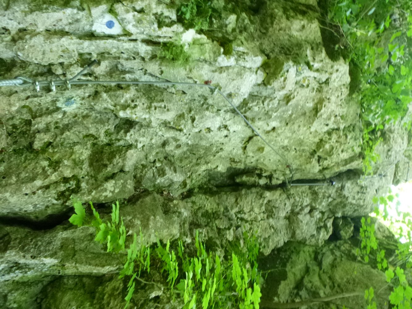 Der blaue Steig beginnt mit einer Kletterstelle (2), gefolgt von einer Abkletterpassage an einem Grat (1-). Auf der anschließenden Erhöhung, direkt auf dem „Gipfel“ beginnt die Seilsicherung. Die erste Wand oberhalb des Klettergartens wird gequert (B/C, meist B). Nachher zu Fuß zur zweiten Wandquerung (B/C, meist B). In Folge ist eine einfache Wandstelle (A/B) zu bewältigen. Dann entlang der Markierung zur Verbindung mit dem roten Steig.