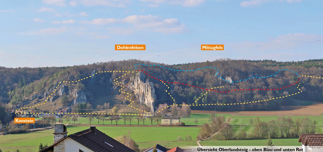Der Ort Konstein ist vor allem für die beeindruckenden Kletterfelsen bekannt. An den steilen Südabbrüchen des Dohlenfelsens wurden Sportkletterrouten geschaffen, die Weltruhm erlangten. Direkt oberhalb der markanten Felsformation verläuft der Oberlandsteig von einer Felswand zur anderen. Es gibt einen etwas schwereren Steig (Blau) und einen ganz leichten (Rot). Die „Hauptattraktion“ sind zwei Felswände, die man seilgesichert komplett quert. Der Reiz der Steiganlage im Tal, in dem früher die Donau floss, ist der Mix aus Kletterpassagen und Landschaft. Es gibt die Möglichkeit das Treiben der Felskletterer zu beobachten oder mit einer Wanderung die Tour zu verlängern.