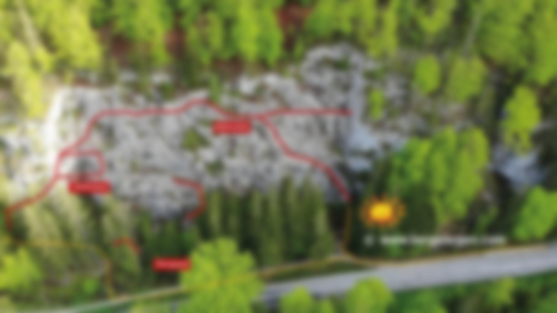 Beschreibung im Uhrzeigersinn: Von der Einstiegstafel über eine Rampe (A/B), eine Querung (B) und einen Aufschwung (A/B) zur ersten Weggabelung: Entweder die kleine Runde – Seilbrücke (B), Steilstufe (B/C) und Seilbrücke (B) – oder direkt (C) hinauf. Über einen Aufschwung (A/B) zu einer Querung (zuerst B, dann A). Mithilfe eines Balanceseils (B) zu einer weiteren Querung (A) und zur zweiten Weggabelung: Dort über Wandstufen (A/B bis B) und Querungen (A) zum Ausstieg am Wandfuß.