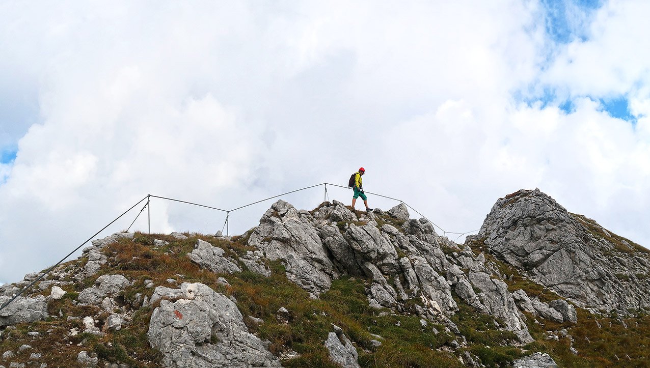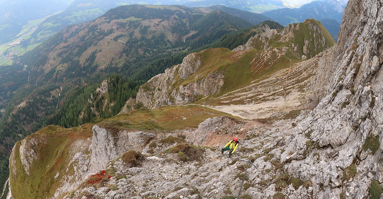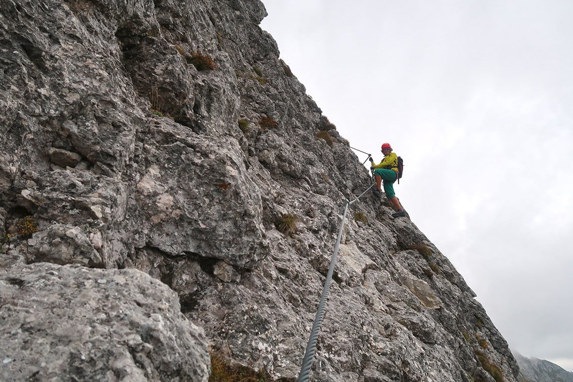 Gut mit Stahlseil und wenigen Trittklammern versichert. Die Ferrata wurde unten im Zuge der Sanierung sogar etwas verlängert.