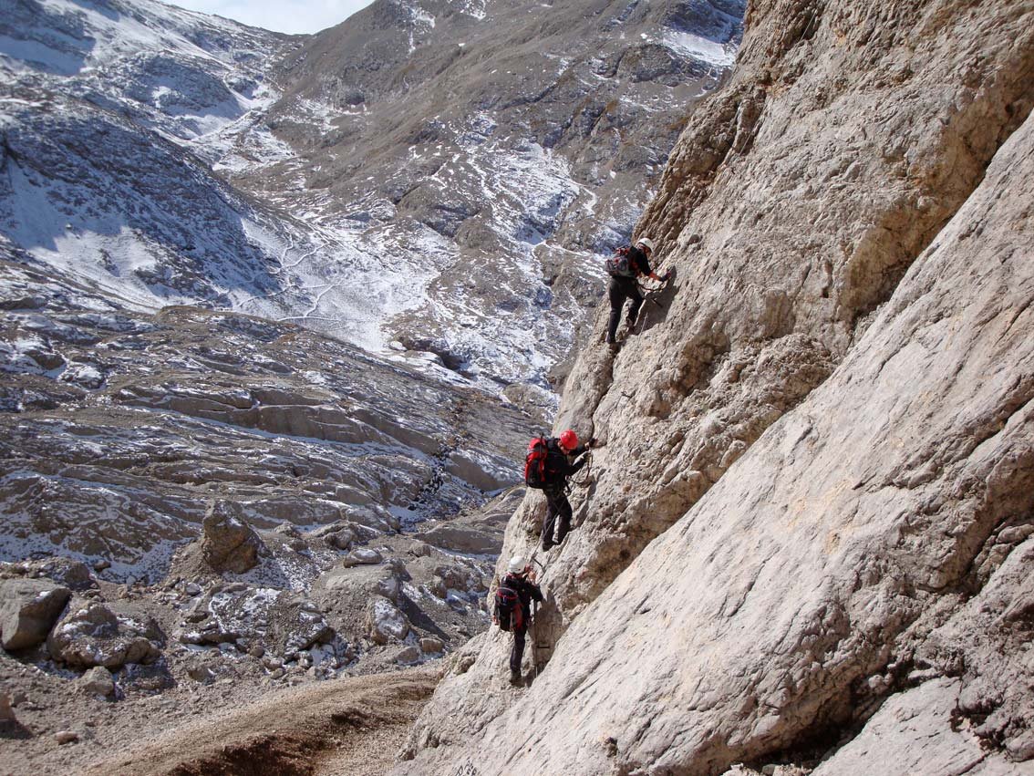 Zustieg und Route: Vom Parkplatz der Seilbahn steigt man auf dem Weg 602 anfangs sehr steil, dann durch ein schönes Hochtal zum Rif. Contrin (2016 m) auf. Von der Hütte folgt man dem Weg 606, dann dem Weg 610 durch das gewaltige Kar hinauf zum Passo de Ombretta (2702 m). Auf dem Pass rechts halten und auf dem Weg 650 zum Biv. M.D. Bianco, das etwas versteckt unweit der Passhöhe auf dem Zackengrat liegt. Am Biwak vorbei gelangt man nach ca. 10 Min. zu einer sperrenden Felsstufe (4 Std./1300 Hm). Gut gesichert und nicht allzu schwierig (A, dann A/B) erreicht man einen Absatz. Danach über Schutt auf den Sattel (viele alte Stellungen) zwischen Cima Mezzo und Cima Orienttale. Vom Sattel in ca. 15 Min. auf den höchsten Punkt (3011m) mit einem kleinen Holzkreuz. Zurück zum Sattel und in das große Schuttkar absteigen, unten hält man sich links (immer der Markierung folgen) und gelangt zu einem Abbruch (2680 m, Ferrata Vernale). Zuerst leicht (A/B und B), dann nach einer Ecke etwas steiler (B/C) abwärts und man steht auch schon am Fuß der Ferrata. (2 Std./230 Hm Aufst.). Weiter auf dem Weg, bis dieser auf den Weg 612 trifft, diesen absteigen und schlussendlich wieder auf dem Weg 607 vorbei an der Contrinalm zum Rifugio. Von dort steigt man auf dem Aufstiegsweg ins Tal (2¾ Std.).