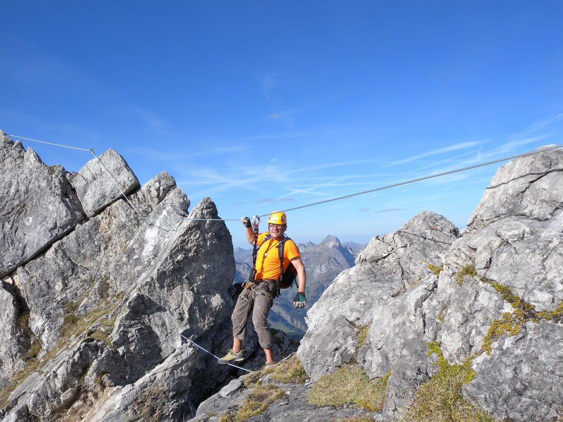 Auch beim Panoramaklettersteig gibt der Gratverlauf die Route vor, es sind aber steile Passagen (C/D) und ein paar ausgesetzte Gratstellen (C und B) zu meistern. Eine sehr schöne Auflockerung sind die zwei Mini-Seilbrücken.