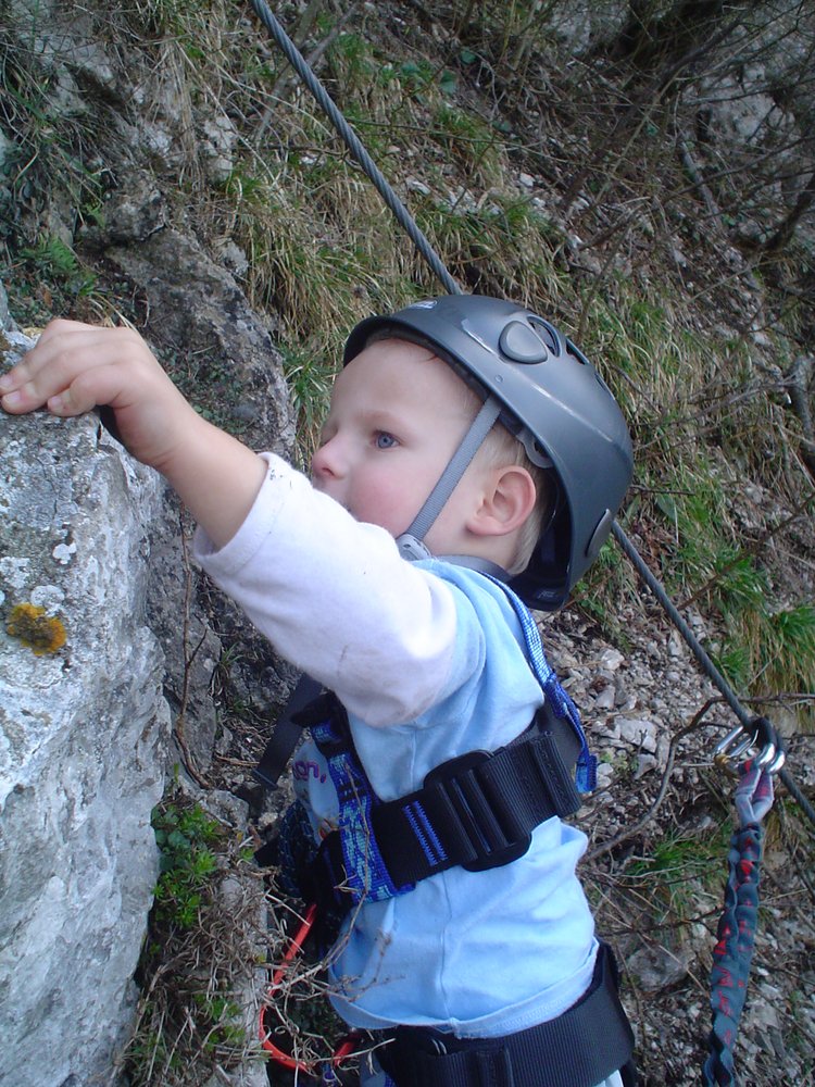 Kompl. Klettersteigausrüstung, Sicherungsseil für Anfänger und Kinder; der Helm ist auch für die "Profis" wichtig, da ab und zu von den Kletterern Steinschlag droht.