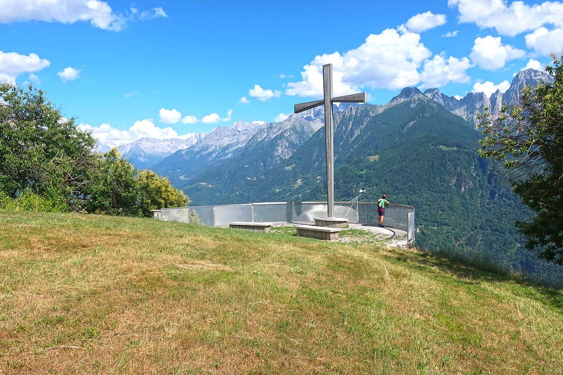 Vom Steigende hinauf zur Wiese neben dem Ort Daloo und nach rechts zum schon sichtbaren Aussichtspunkt. Beim Aussichtspunkt beginnt der Wanderweg zurück nach Pianazzola, auf dem man durch den Buschwald wieder bis zum Parkplatz absteigt.