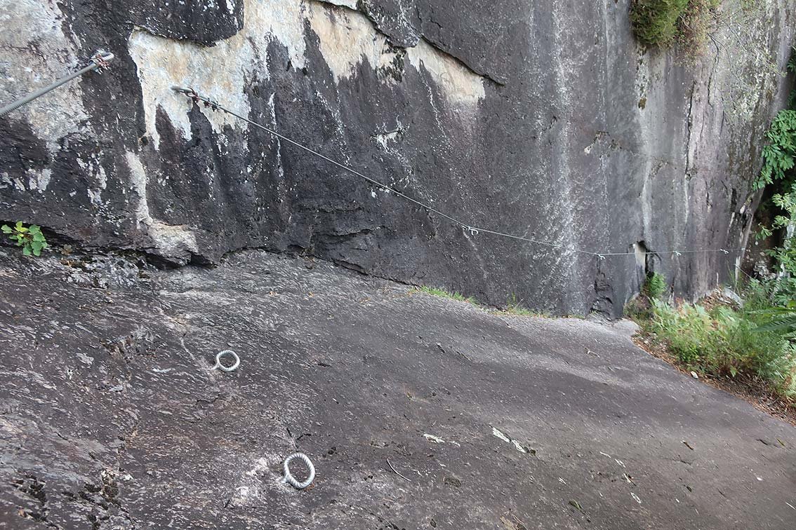 Der Percorso Attrezzato Daloo ist die deutlich einfachere Variante zur Ferrata Pietro Biasini. Über Rampen und kurze Steilstufe erreicht man das Plateau mit dem Bergdorf Daloo. Nach dem man etwas beim schönen Aussichtspunkt mit dem perfekten Bergell-Blick verweilt hat, steigt man auf dem Wanderweg wieder nach Pianazzola ab. Für Einsteiger und Kinder (der Steig ist aber lang; evtl. Sicherungsseil) ist diese Aufstiegsmöglichkeit sicher eine Alternative zur fordernden Ferrata links davon.