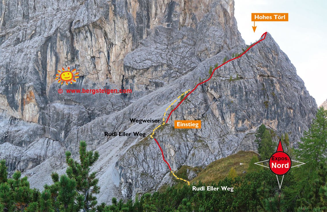 Links haltend über den Rudl-Eller-Weg zurück zum Ausgangspunkt, altrernativ auf dem Rudl-Eller Weg weiter unterhalb der Laserzwand entlang bis zum Fahrweg, dann auf diesem entweder zur Karlsbaderhütte aufsteigen oder zur Dolomitenhütte absteigen.