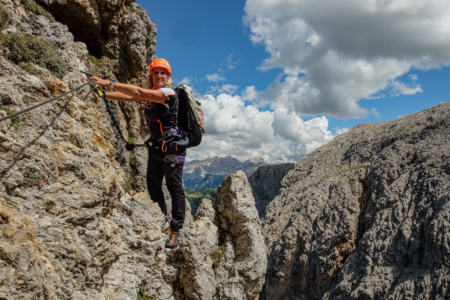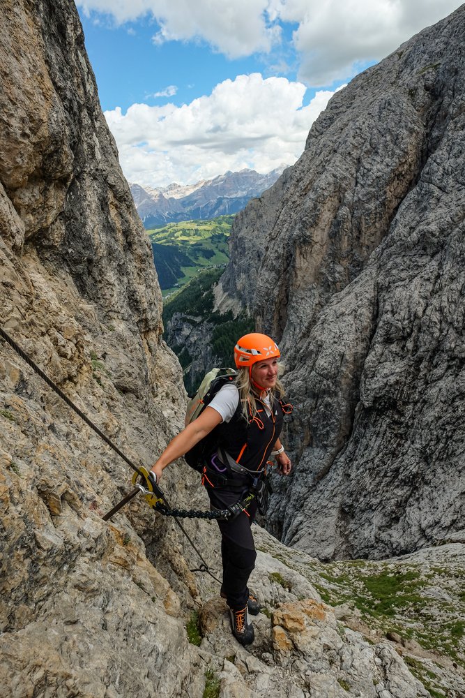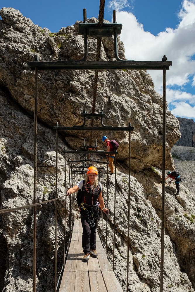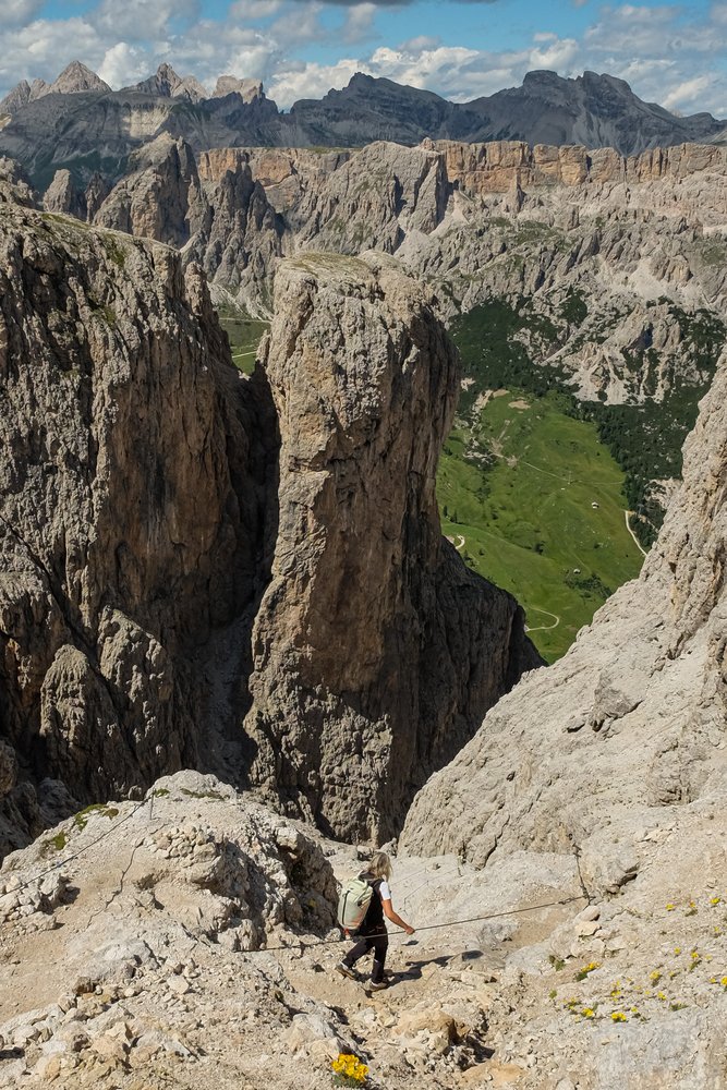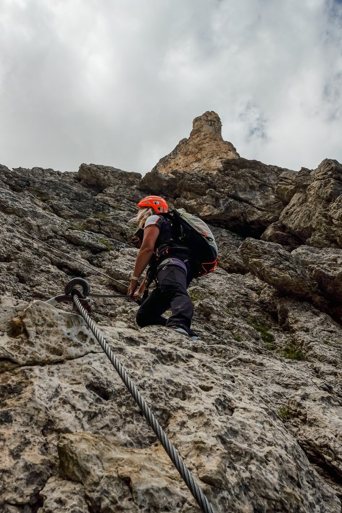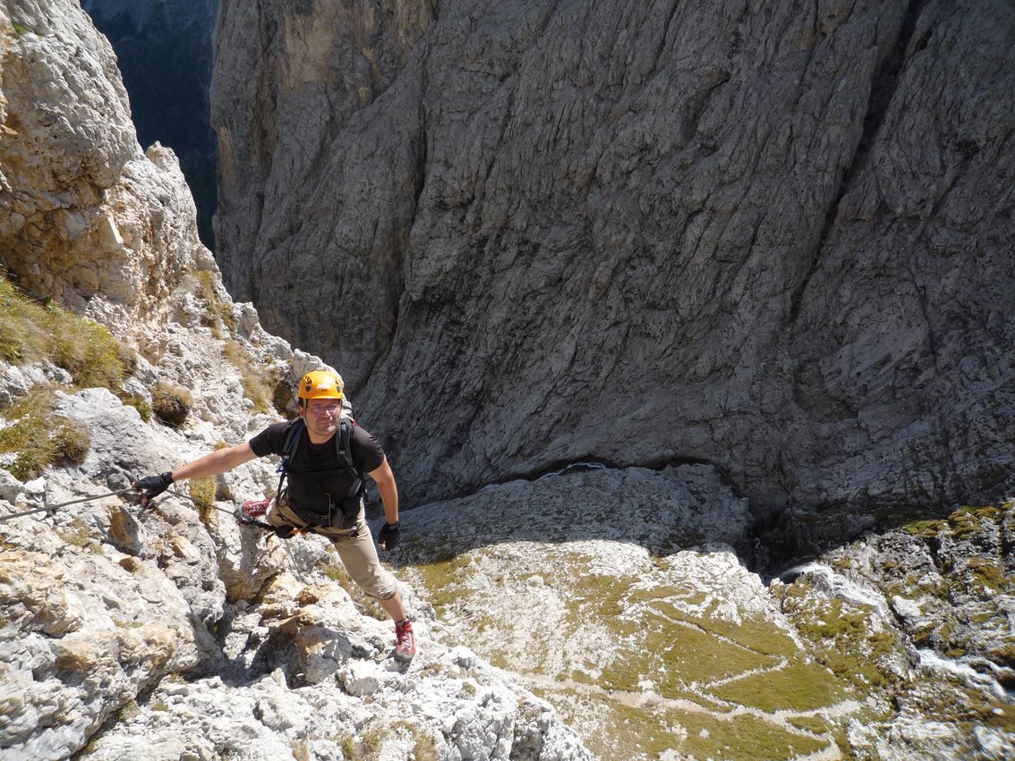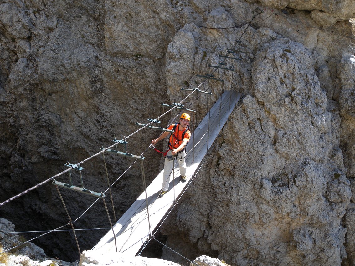 Der Pisciadu Klettersteig in der Sella Gruppe ist die meistbegangene Via ferrata in den Dolomiten, wobei die Berühmtheit vollkommen gerechtfertigt ist: Der Steig besitzt einen Parkplatz beim Einstieg, fordernde - aber niemals besonders schwierige - Passagen in einer Kulisse, die ihresgleichen sucht, imposante senkrechte Kletterpassagen am Exnerturm, eine Hängebrücke, eine bewirtschaftete Hütte mit Bergsee beim Ausstieg, ein lohnendes Gipfelziel (Cima Pisciadù, 2985 m) und nicht zuletzt den landschaftlich schönen Abstieg durch das Mittagstal. Gerade deshalb sollte man etwas Zeit mitbringen - Staugefahr ist an Wochenenden meist vorprogrammiert. Der Klettersteig ist der Auftakt für die Sella-Durchquerung, große Gruppen machen das Überholen fast unmöglich - wer es genießen will kommt an einem Wochentag oder steigt später ein.
