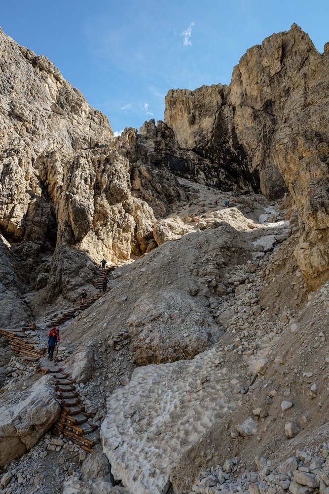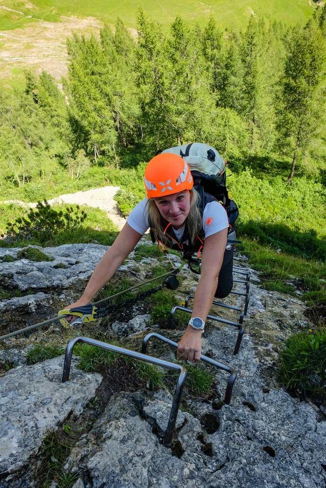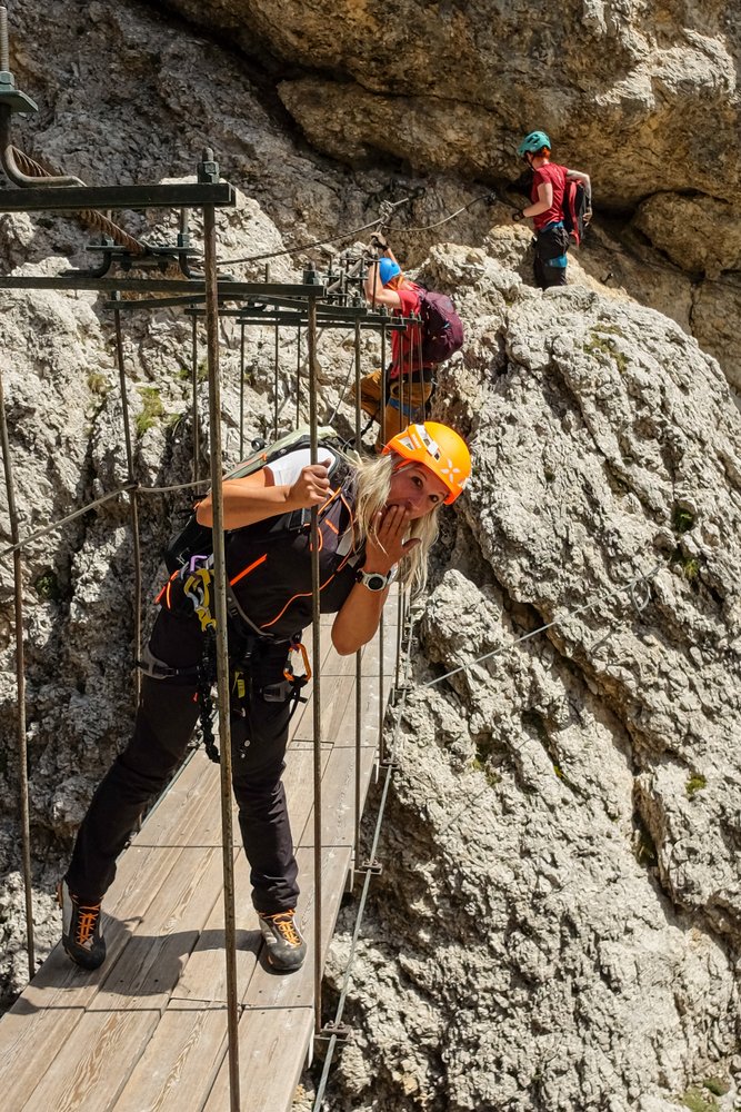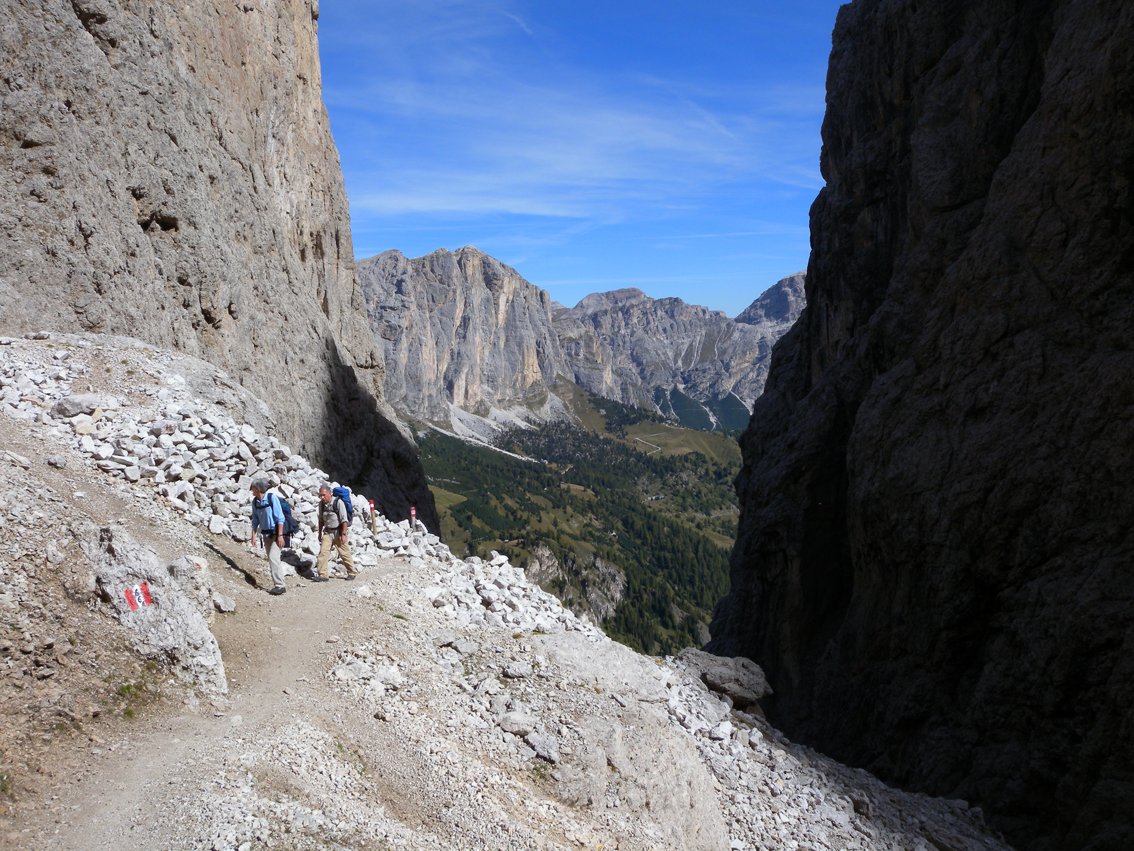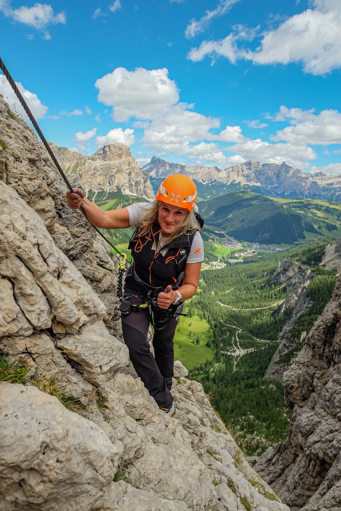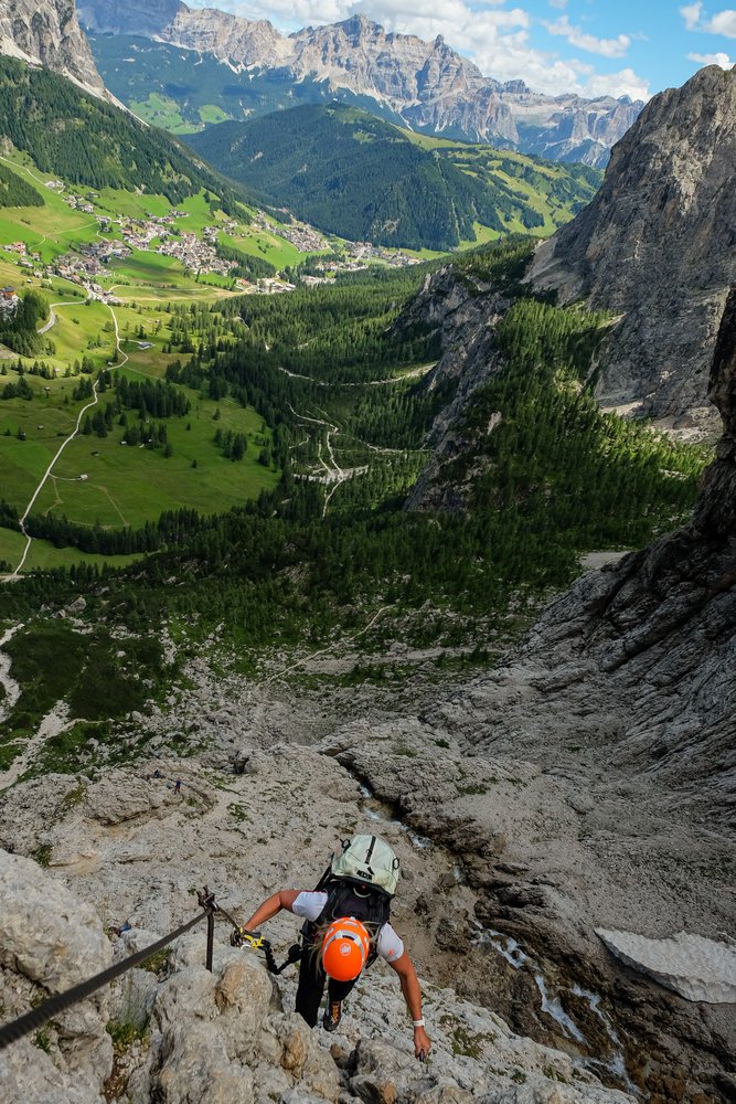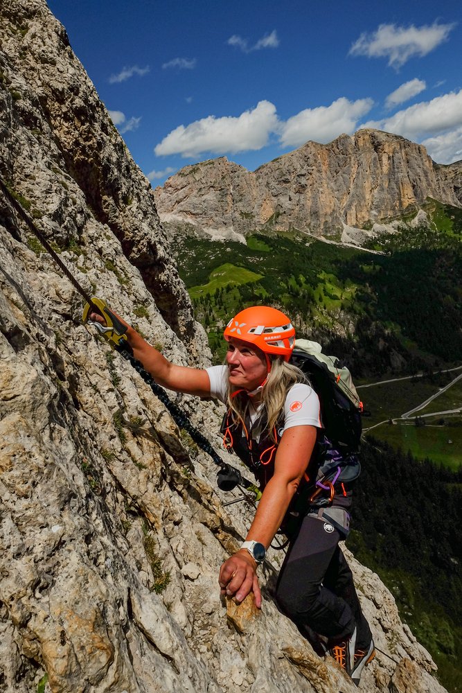 Der Pisciadu Klettersteig in der Sella Gruppe ist die meistbegangene Via ferrata in den Dolomiten, wobei die Berühmtheit vollkommen gerechtfertigt ist: Der Steig besitzt einen Parkplatz beim Einstieg, fordernde - aber niemals besonders schwierige - Passagen in einer Kulisse, die ihresgleichen sucht, imposante senkrechte Kletterpassagen am Exnerturm, eine Hängebrücke, eine bewirtschaftete Hütte mit Bergsee beim Ausstieg, ein lohnendes Gipfelziel (Cima Pisciadù, 2985 m) und nicht zuletzt den landschaftlich schönen Abstieg durch das Mittagstal. Gerade deshalb sollte man etwas Zeit mitbringen - Staugefahr ist an Wochenenden meist vorprogrammiert. Der Klettersteig ist der Auftakt für die Sella-Durchquerung, große Gruppen machen das Überholen fast unmöglich - wer es genießen will kommt an einem Wochentag oder steigt später ein.