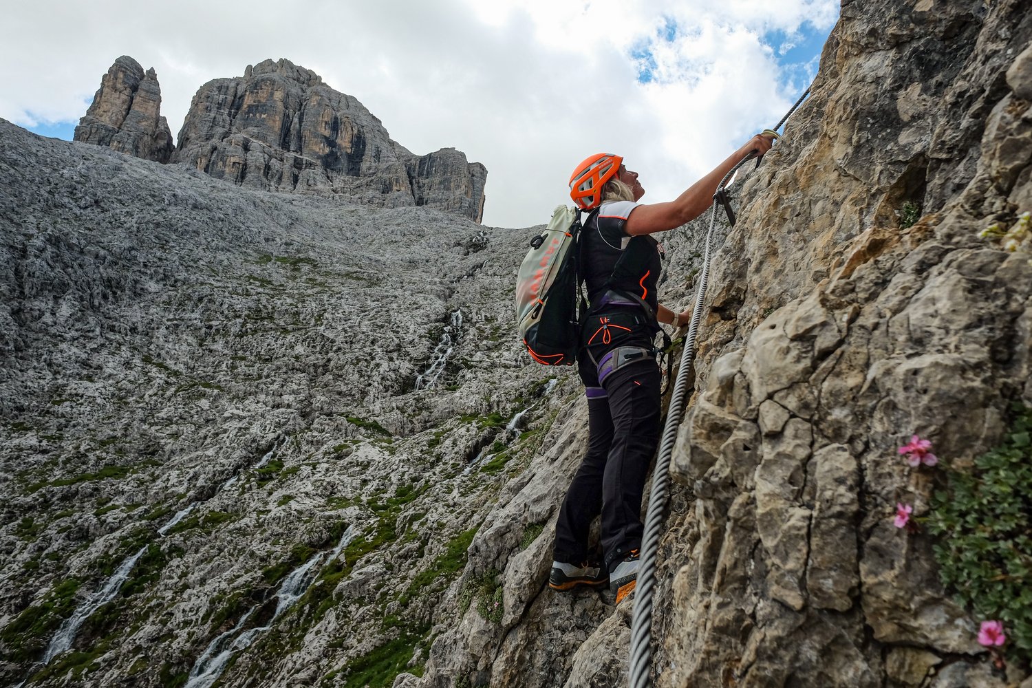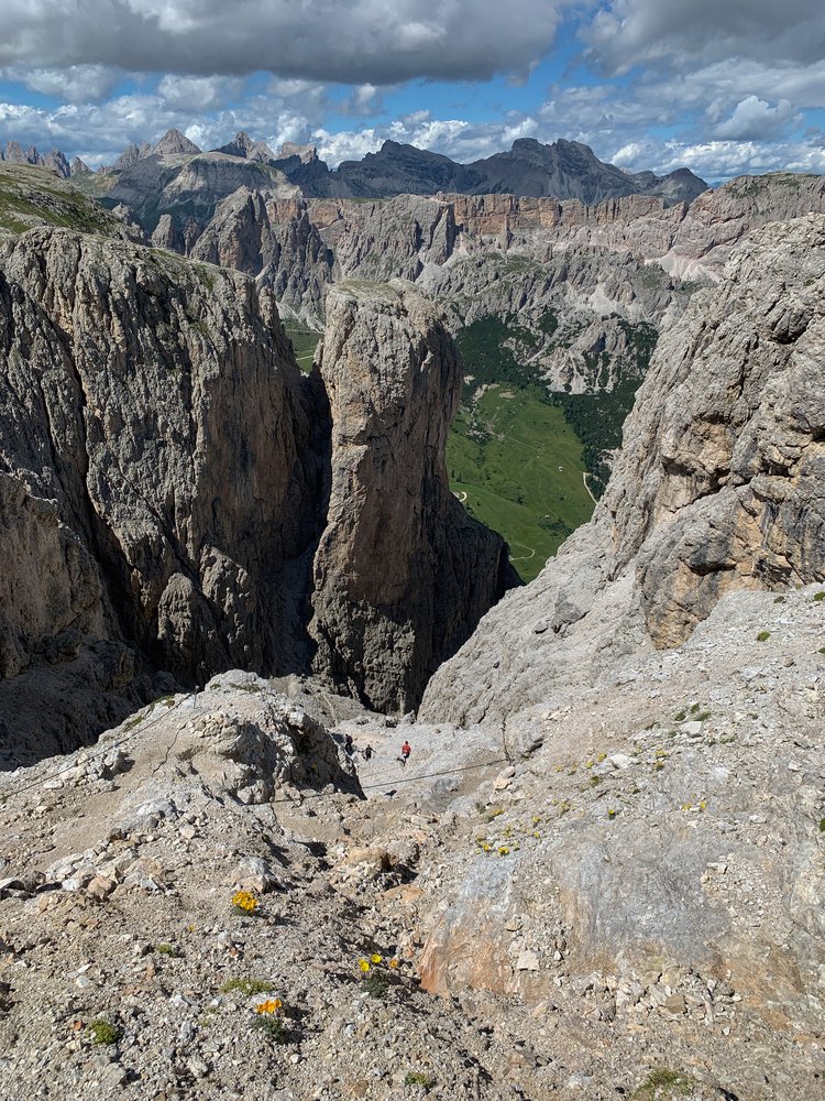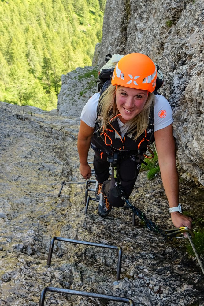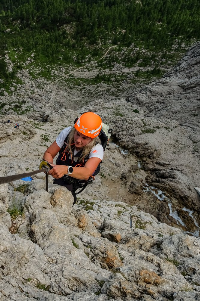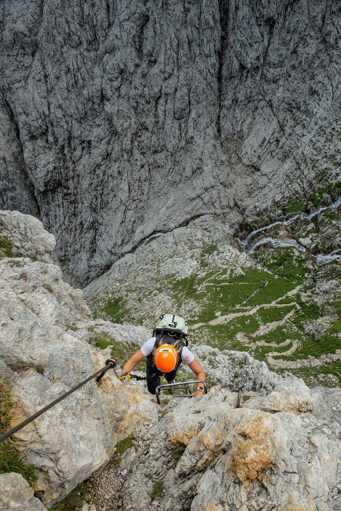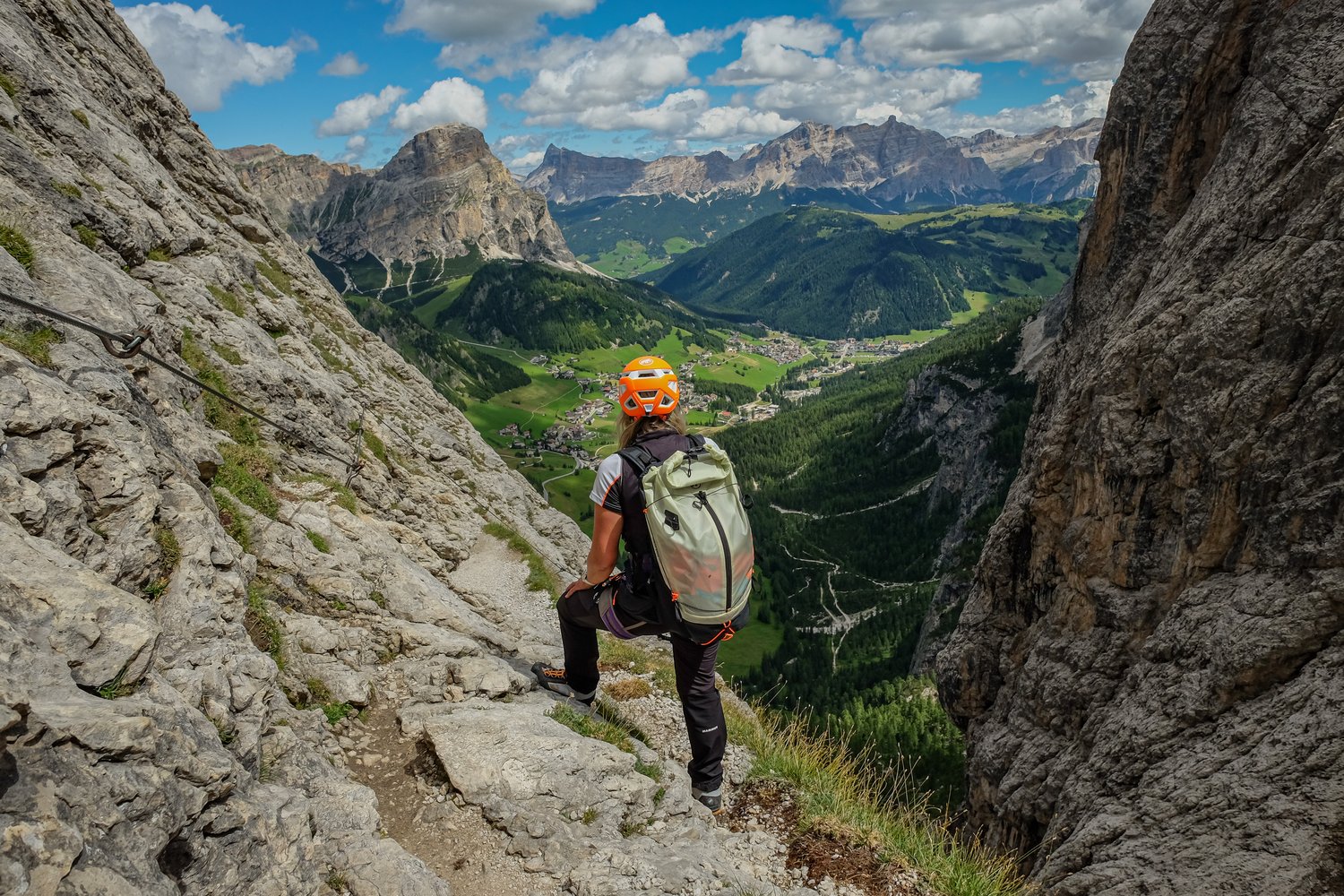 Der Pisciadu Klettersteig in der Sella Gruppe ist die meistbegangene Via ferrata in den Dolomiten, wobei die Berühmtheit vollkommen gerechtfertigt ist: Der Steig besitzt einen Parkplatz beim Einstieg, fordernde - aber niemals besonders schwierige - Passagen in einer Kulisse, die ihresgleichen sucht, imposante senkrechte Kletterpassagen am Exnerturm, eine Hängebrücke, eine bewirtschaftete Hütte mit Bergsee beim Ausstieg, ein lohnendes Gipfelziel (Cima Pisciadù, 2985 m) und nicht zuletzt den landschaftlich schönen Abstieg durch das Mittagstal. Gerade deshalb sollte man etwas Zeit mitbringen - Staugefahr ist an Wochenenden meist vorprogrammiert. Der Klettersteig ist der Auftakt für die Sella-Durchquerung, große Gruppen machen das Überholen fast unmöglich - wer es genießen will kommt an einem Wochentag oder steigt später ein.