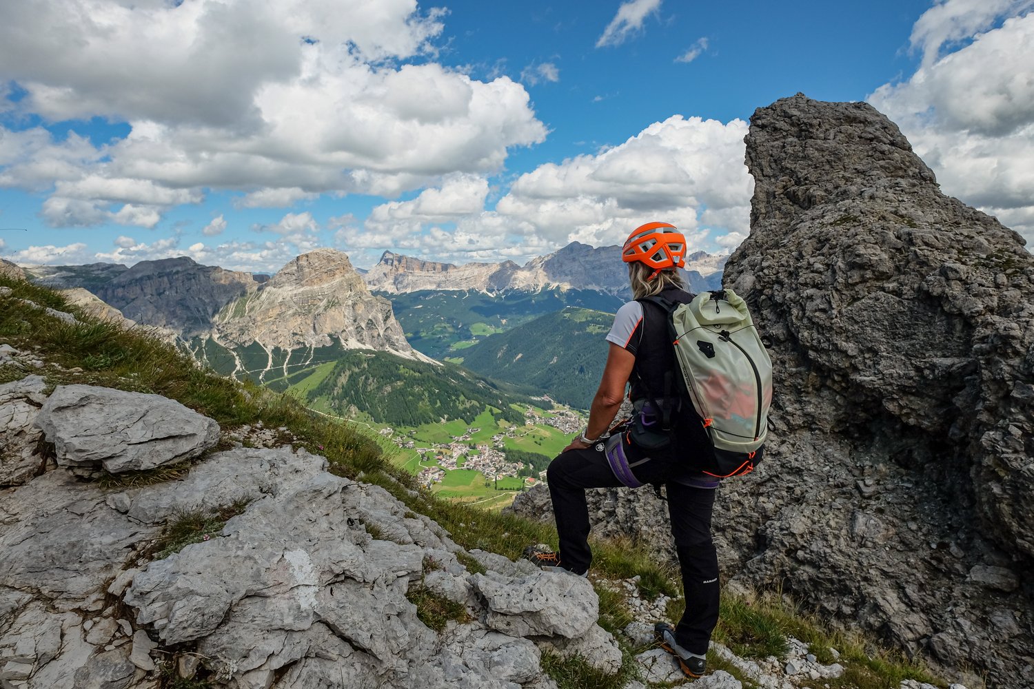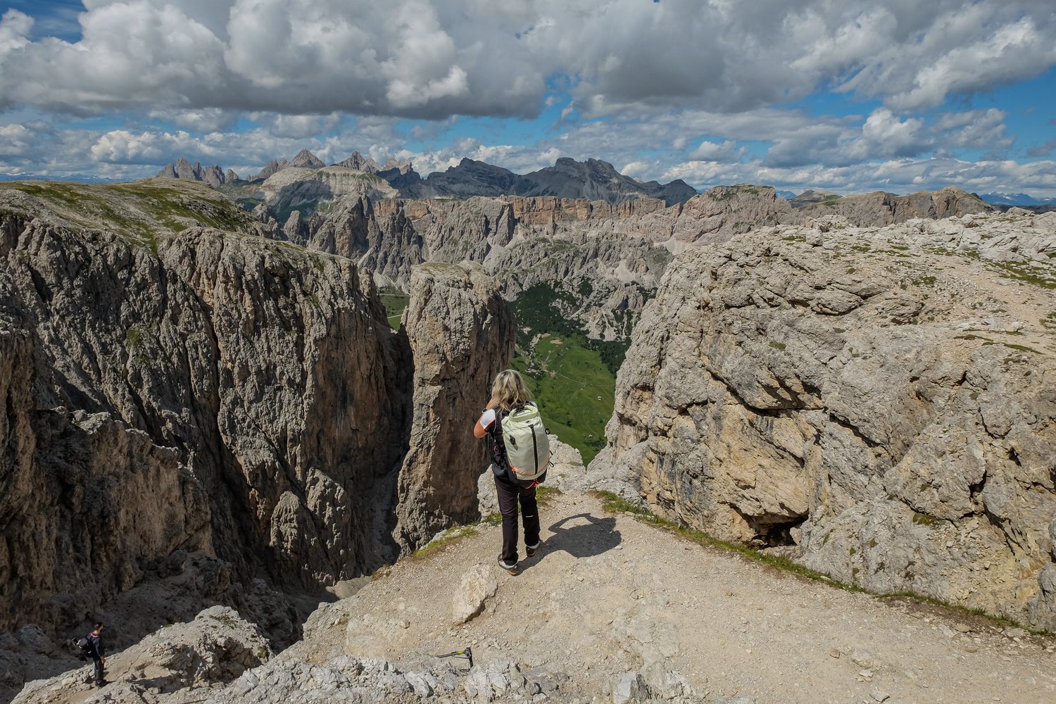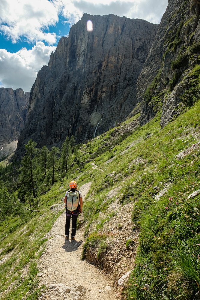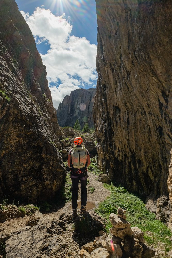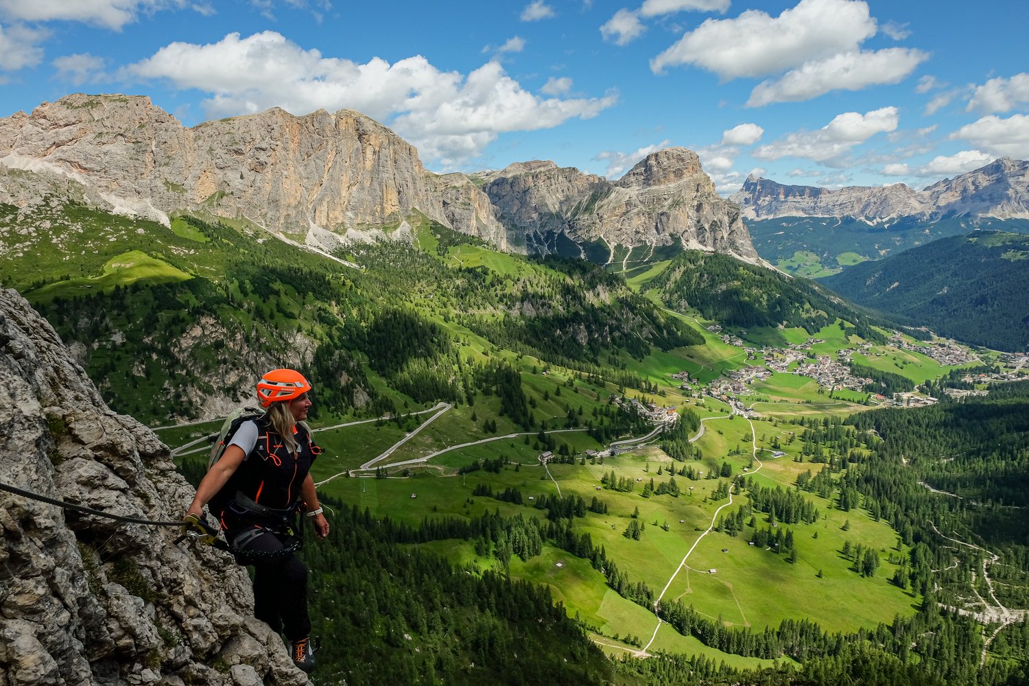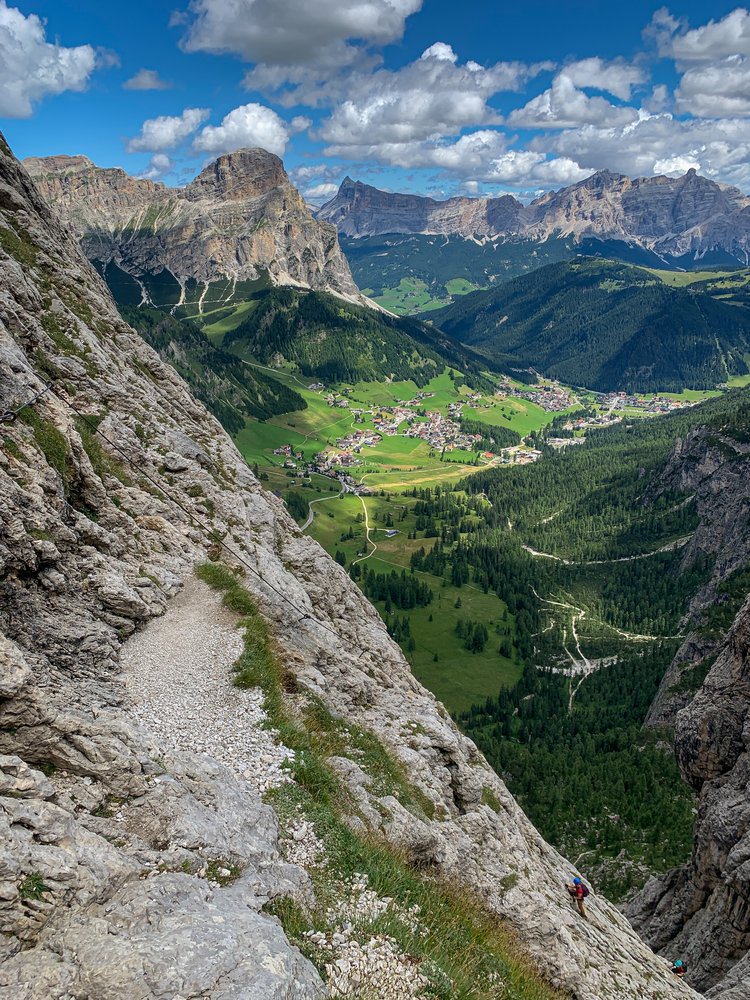 Der Pisciadu Klettersteig in der Sella Gruppe ist die meistbegangene Via ferrata in den Dolomiten, wobei die Berühmtheit vollkommen gerechtfertigt ist: Der Steig besitzt einen Parkplatz beim Einstieg, fordernde - aber niemals besonders schwierige - Passagen in einer Kulisse, die ihresgleichen sucht, imposante senkrechte Kletterpassagen am Exnerturm, eine Hängebrücke, eine bewirtschaftete Hütte mit Bergsee beim Ausstieg, ein lohnendes Gipfelziel (Cima Pisciadù, 2985 m) und nicht zuletzt den landschaftlich schönen Abstieg durch das Mittagstal. Gerade deshalb sollte man etwas Zeit mitbringen - Staugefahr ist an Wochenenden meist vorprogrammiert. Der Klettersteig ist der Auftakt für die Sella-Durchquerung, große Gruppen machen das Überholen fast unmöglich - wer es genießen will kommt an einem Wochentag oder steigt später ein.