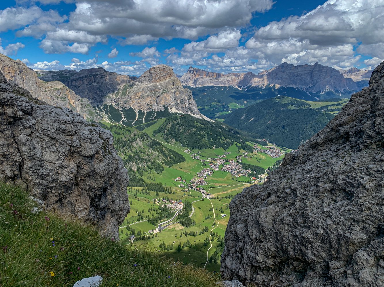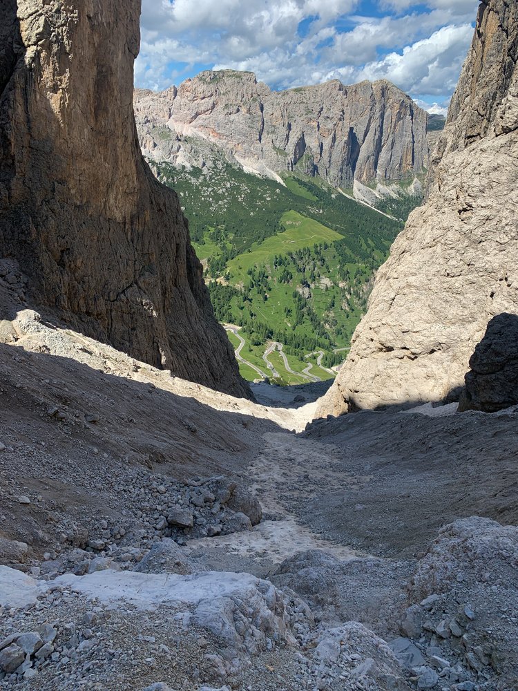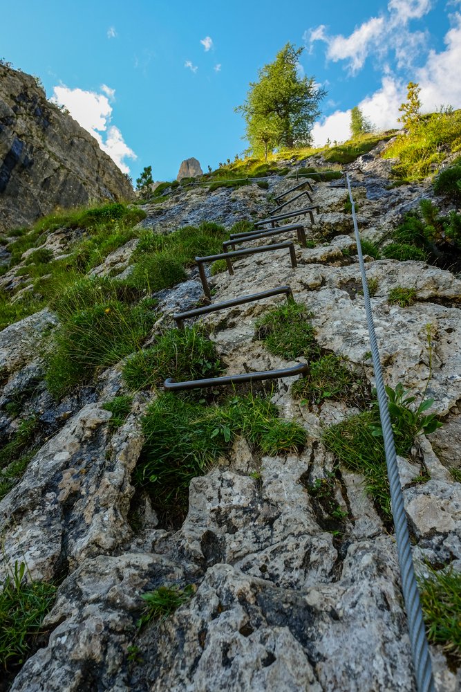 b) Schöner, aber etwas länger der Abstieg durch das Mittagstal (Val de Mesdi): Auf dem Weg 676 nach Osten und auf ca. 20 Hm versichert (A) ins Mittagstal, wo man auf dem Talboden auf den Weg 651 vom Rif. Boe trifft. Diesen Weg ca. 600 m (nicht Hm!) absteigen, links unter den Nordwänden des Östl. Masores, vorbei am Einstieg des Hauptsteiges und auf dem Band über der Einstiegswand zur Verbindung mit dem Abstieg a), dann rechts zum Parkplatz, (1¾ Std.).