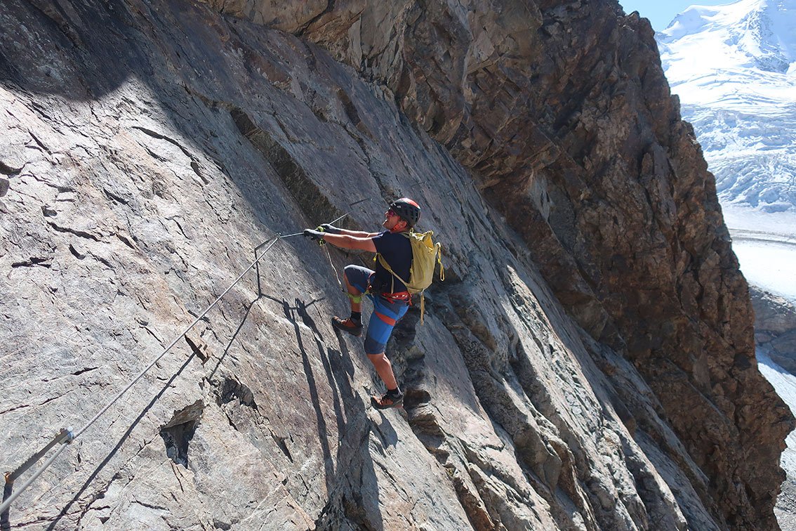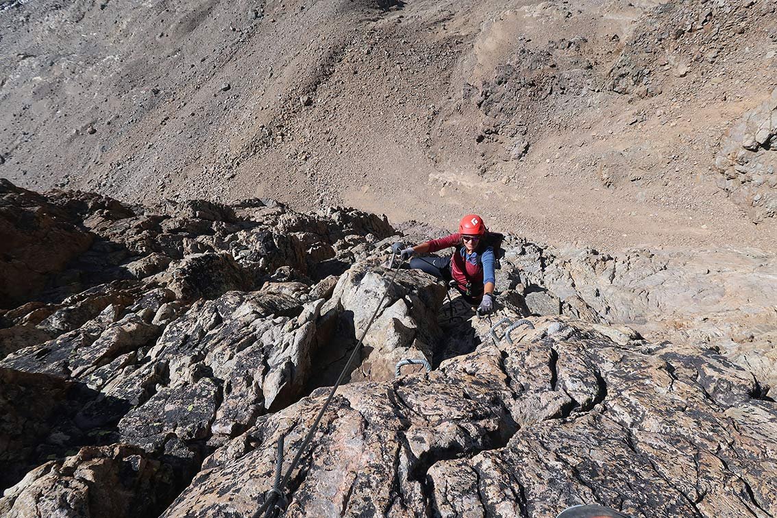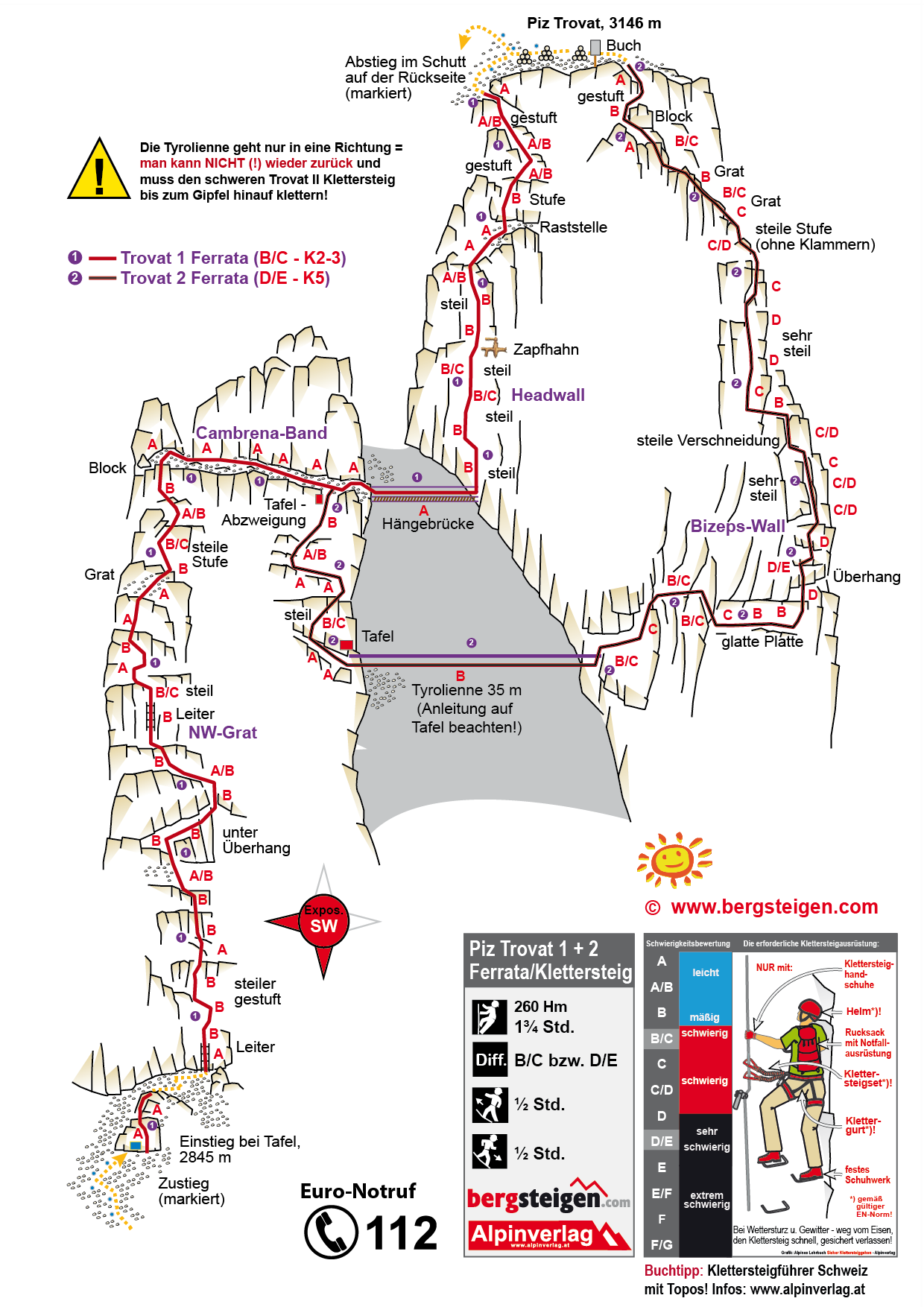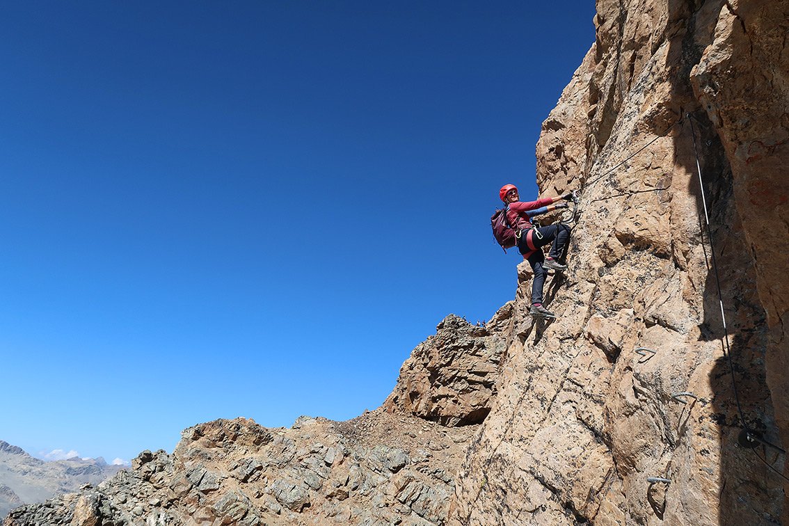 Piz Trovat II ist anstrengend und kräfteraubend, man kann auch nach der Tyrolienne NICHT mehr zurück! Die Mindestgröße des Begehers sollte 1,60 Meter betragen, da die Griffe sonst zu weit auseinander liegen.