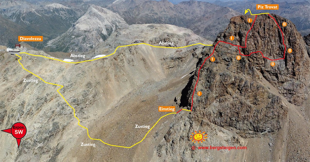 Der Trovat 2 Klettersteig ist ein knackiger Ausstieg am Piz Trovant und galt früher als schwierigste und sicher die schönste Mutprobe in der gesamten Schweiz. Nur 20 Minuten von der Bergstation Diavolezza entfernt führt seit 2006 ein mittelschwerer Steig am Piz Trovat I über den Westpfeiler zu einer tollen Hängebrücke und durch die glatte Südwestwand hinauf zum Gipfel. Vor der Brücke kann man seit Mitte 2011 zur Extremvariante Piz Trovat Klettersteig II absteigen. Eine 35 m lange Tyrolienne führt zum schwierigsten Teil der Südwestwand, der sogenannten Bizeps-Wall. Dort ist ein Überhang der Schlüsse zum Erfolg, bei dem bei untrainierten fast die Oberarmmuskeln platzen.