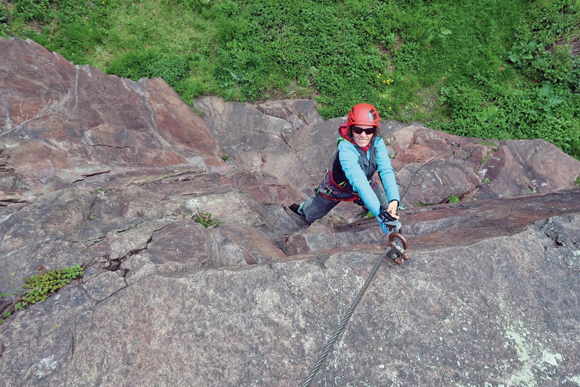 Komplette Klettersteigausrüstung und Helm. Wegen des glatten Felsens sind Kletterschuhe von Vorteil. Für schwächere Kletterer ein Sicherungsseil.