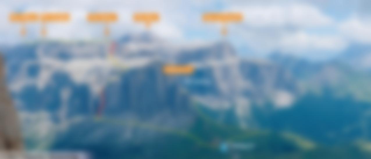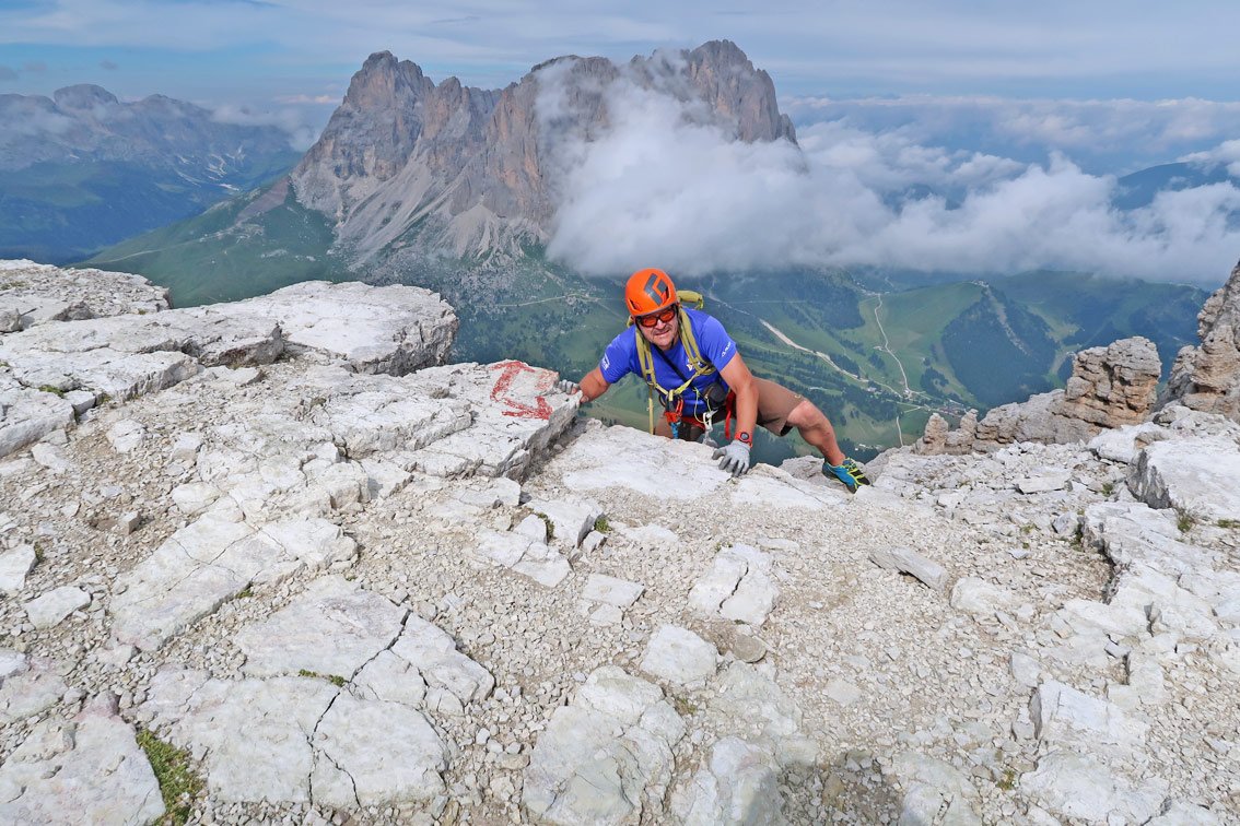 Siehe Topo: Vom Einstieg gleich über eine fast senkrechte, trittarme Verschneidung (B/C). Dann kurz (C/D) auf einen Absatz, auf dem der Originalweg dazukommt. Weiter durch zwei senkrechte Kamine, von denen der erste Kamin Stellen ohne Sicherungsseil hat und ungesicherte Kletterstellen aufweist (B und 2) - Kletterei im 2ten Grad! Man verlässt den Klettersteig in der Hauptwand über eine äußerst luftige Leiter (B), dann noch ca. 100 Höhenmeter steil und mäßig schwierig (B, eine Stellen C) durch seichte Kamine und Rinnen empor zum Schuttkessel. Weiter zum zweiten Sella-Ringband und dort nach links auf einen Sattel (2726 m) zwischen Piz Ciavazes und Piz Selva. Vom Sattel zu einer Schlucht queren. In der Schlucht zuerst gesichert (B/C), dann über mäßig schwierige Felsen (1) und Klettersteigstufen (A/B) zum Gipfel des Piz Selva (2941 m).