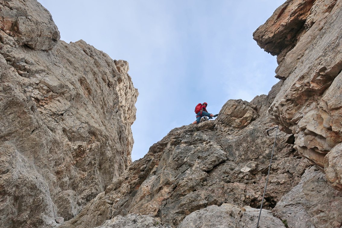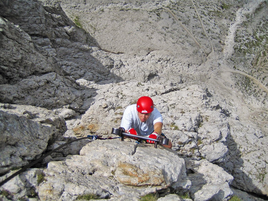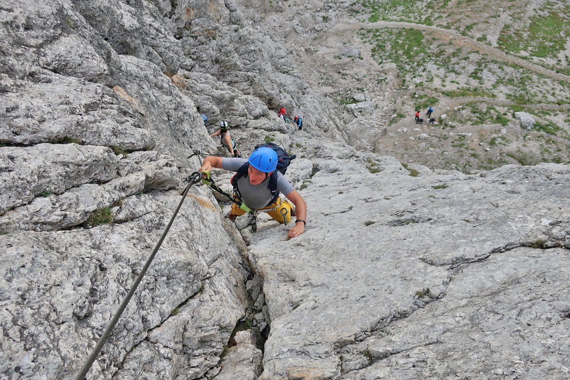 Der Pößnecker Klettersteig ist einer der ältesten Klettersteige in den Dolomiten (1912) und zählt heute noch zu den anspruchsvolleren Steigen. Die Schwierigkeiten beschränken sich auf die ersten 250 Hm, auf die eine lange, reizvolle Bergwanderung über das Sellaplateau folgt. Der Fels wurde in den letzten 100 Jahren von unzähligen Begehern sehr glatt poliert. Der Einstieg kann nach klaren Sommernächten vereist sein! Durch den langen Abstieg eine anstrengende Bergtour, die man nur bei absolut sicheren Wetterverhältnissen machen sollte. Gerade deshalb ist der „Pößnecker“ aber eines der Dolomitenhighlight schlechthin, spürt man doch sowohl beim alpinen Vertikalaufstieg als auch beim landschaftlich sehr eindrucksvollen Abstieg das pure Dolomitenfeeling - zum Schluss sogar in den Füßen.