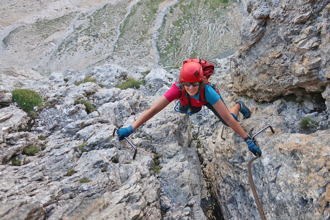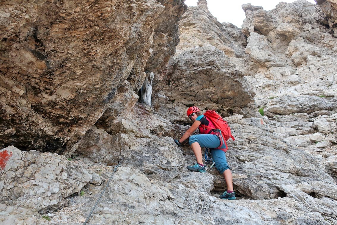 Klettersteigausrüstung und Helm. Für Ungeübte ein Sicherungsseil für die nicht versicherten Stellen!