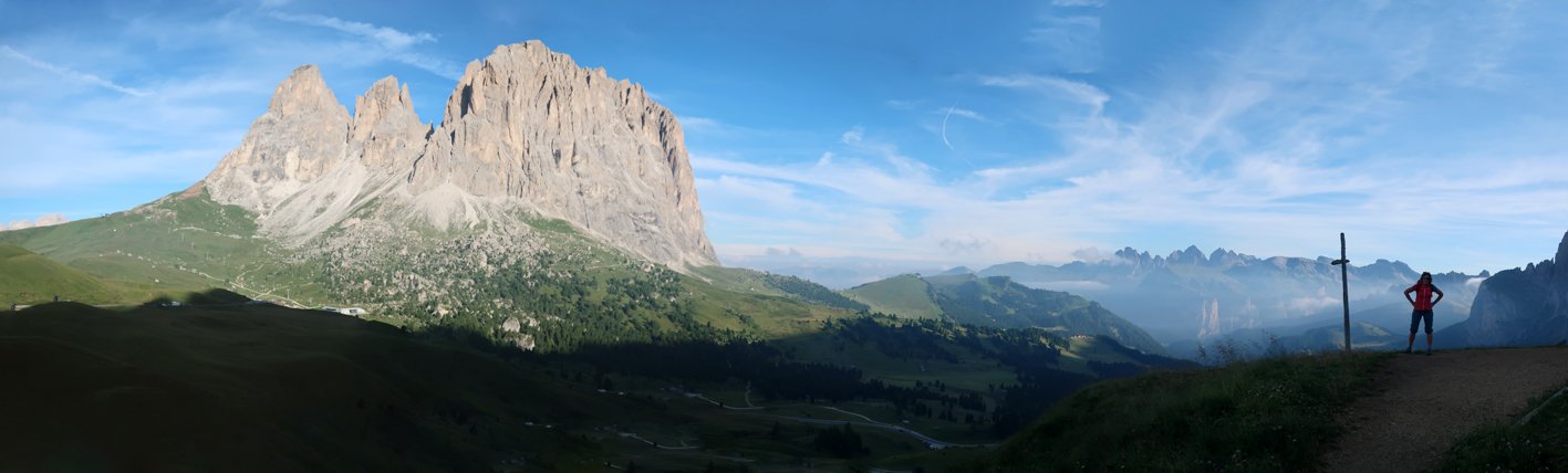 Vom Sellajoch (evtl. Busfahrzeiten für die Rückfahrt eruieren) auf dem markierten Weg (649) am Nordfuß der Sellatürme, entlang der Wände, nach Nordosten zum Einstieg bei einem der Wand vorgelagerten Felsturm bei einer Tafel auf ca. 2280 m.