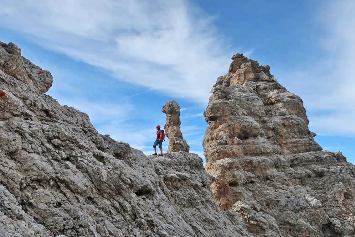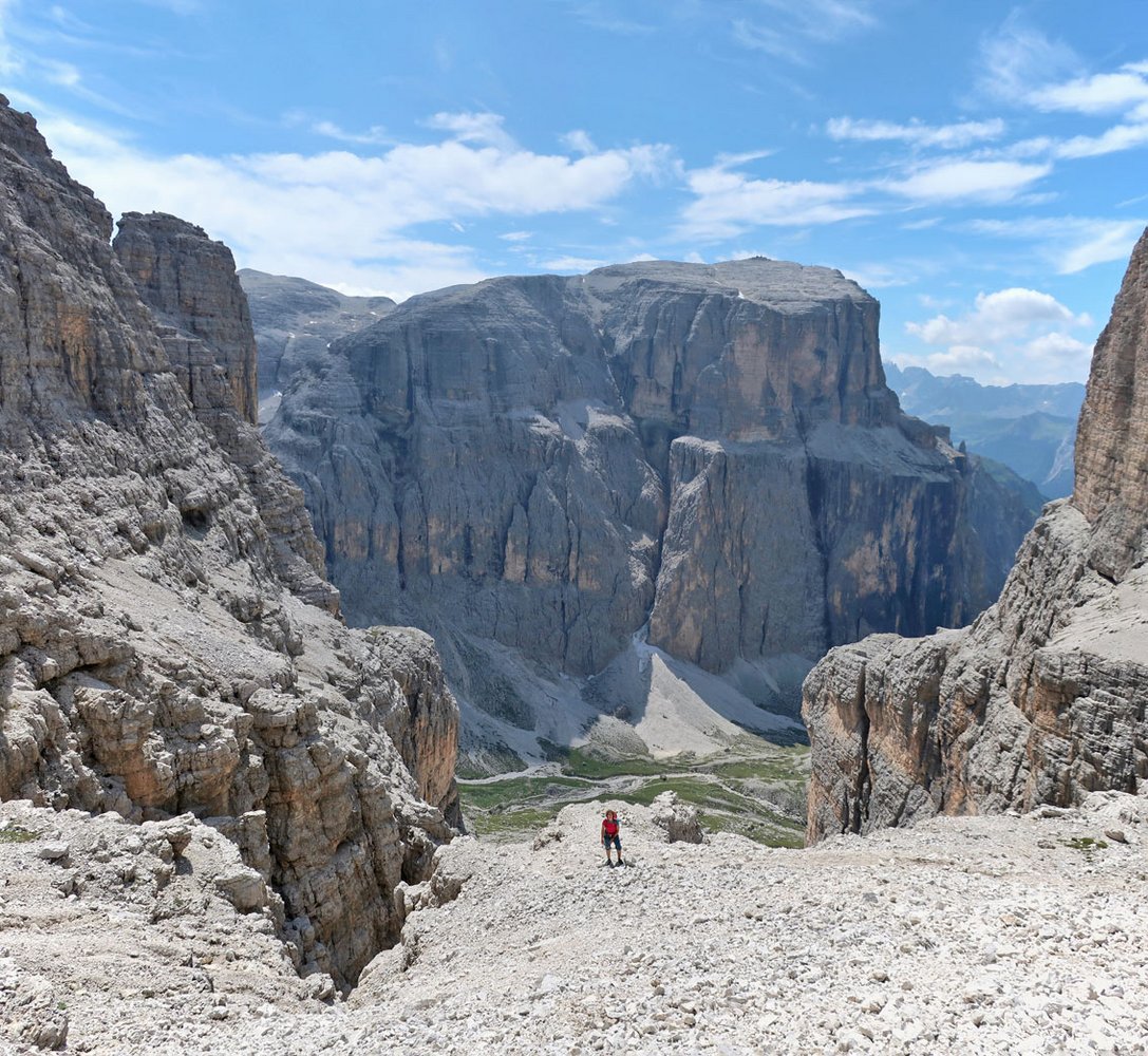 Unten bei den Kaminen und im oberen Teil gibt es einige nicht versicherte Stellen, etwas Klettererfahrung/Trittsicherheit nötig! Für schwächere Geher empfiehlt sich die Mitnahme eines Sicherungsseiles (damit sollte man aber auch umgehen können). Auch das Wetter sollte bei dem reizvollen, aber längeren Abstieg durch das Val Lasties genau beobachtet werden. Auf den Wegen stehen keine Hütten zur Verfügung. Bei einem Umweg von 30 Min. kann man das Rif. Boè (2879 m) erreichen. Auch das Rif. Pisciadù (2585 m) ist im Nahbereich des Sellaplateaus. Oft kommt es an schönen Sommertagen zu Wartezeiten am Einstieg!