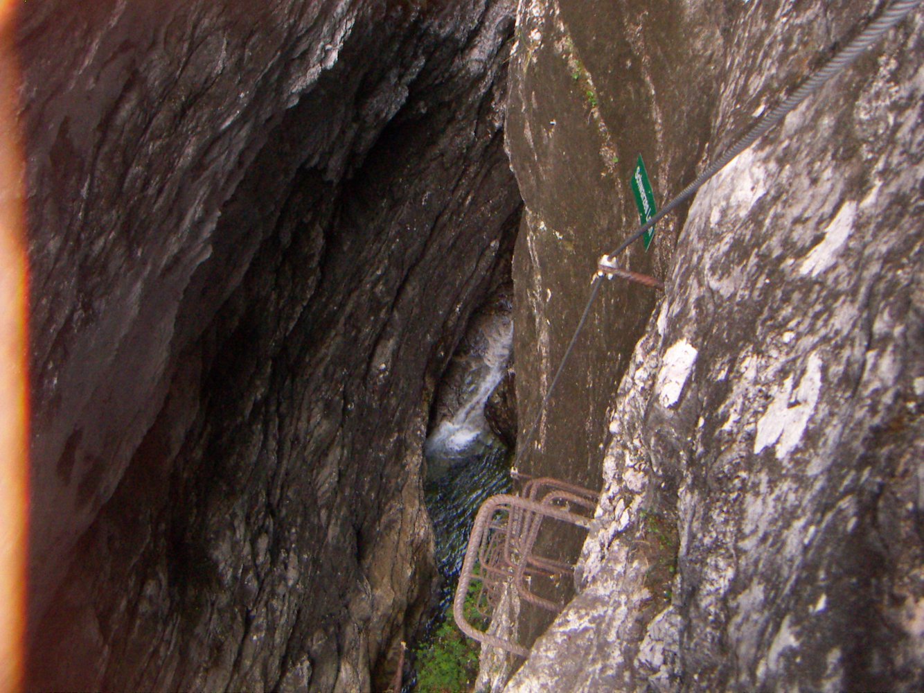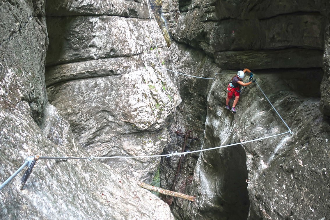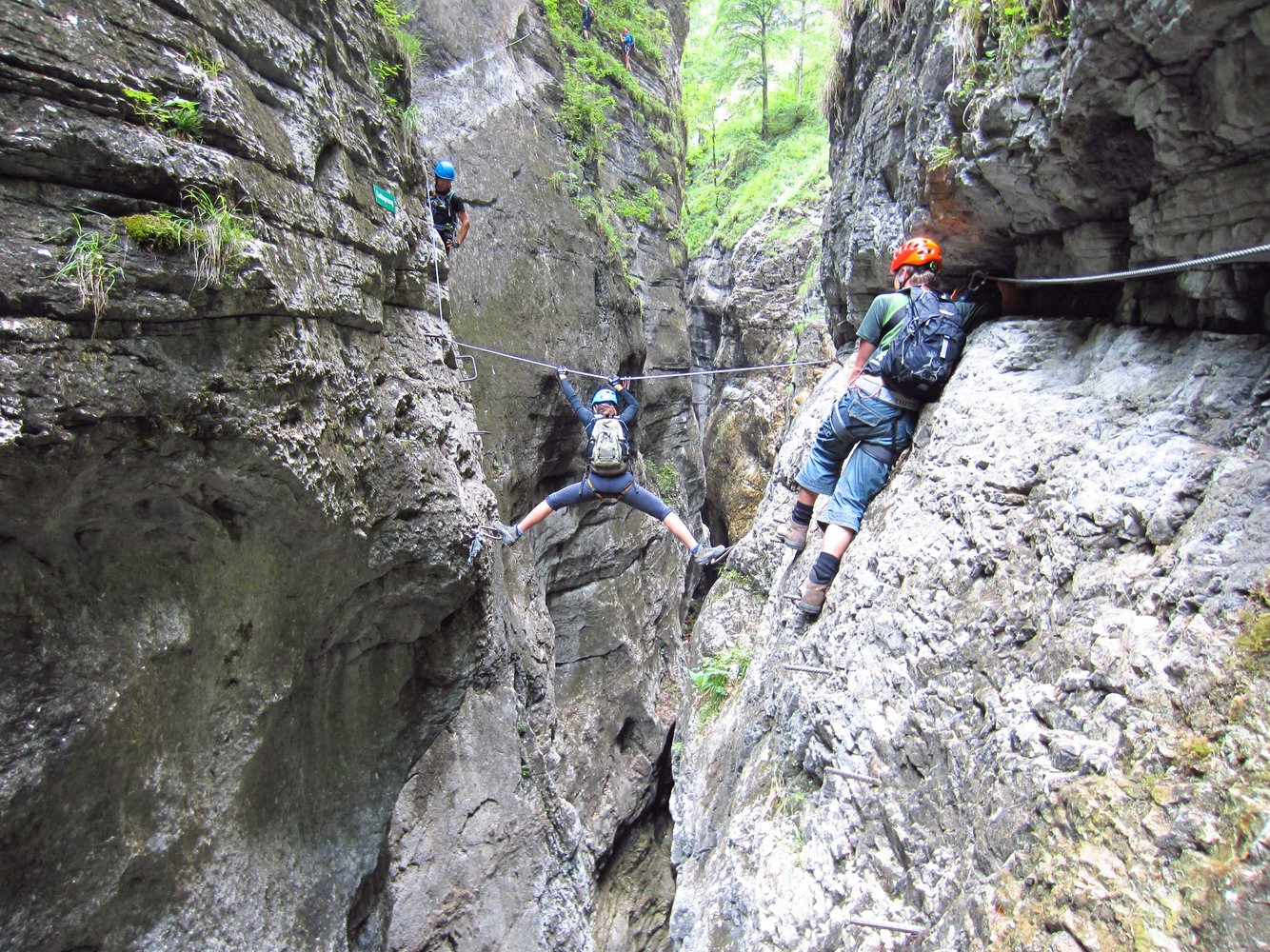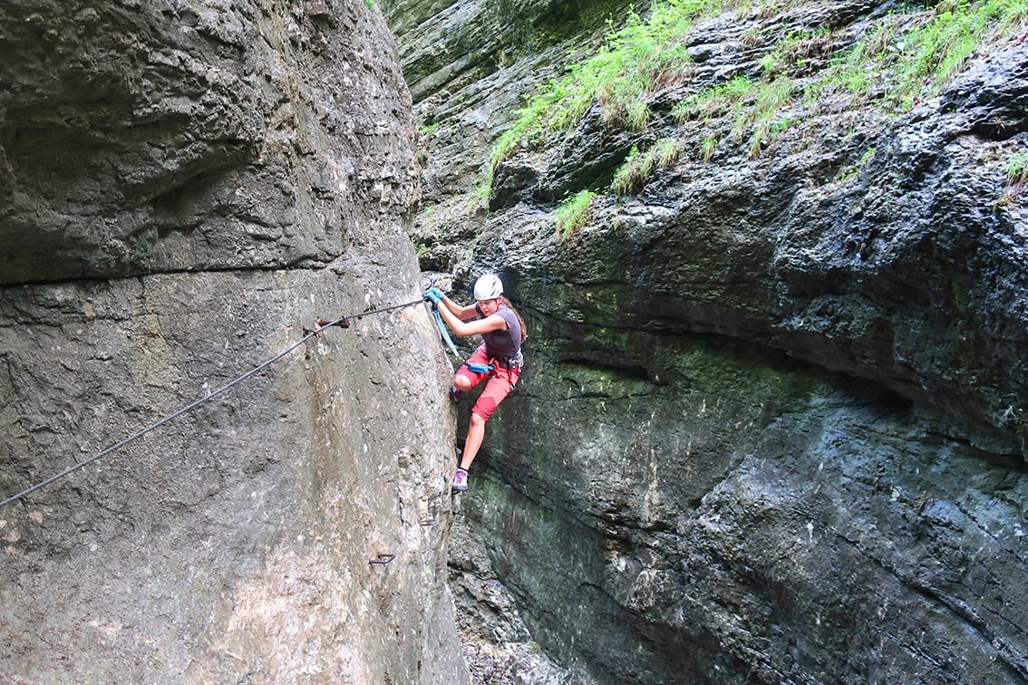 Gamsleckenwand: Auf dem Pfad weiter zur sehr steilen und überhängenden Schlusswand, der sog. Gamsleckenwand (D, wer dort schon genug hat, kann nach links auf schönem Steig leicht aus der Schlucht aussteigen). Der Klettersteig geht ab dort rechts über zwei Überhänge, über einen langen und luftigen Quergang und die anschließende Steilwand wird der vorläufige Ausstieg erreicht. In diesem Bereich gibt es auch eine kurze F-Variante.