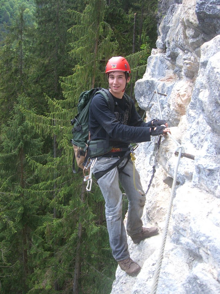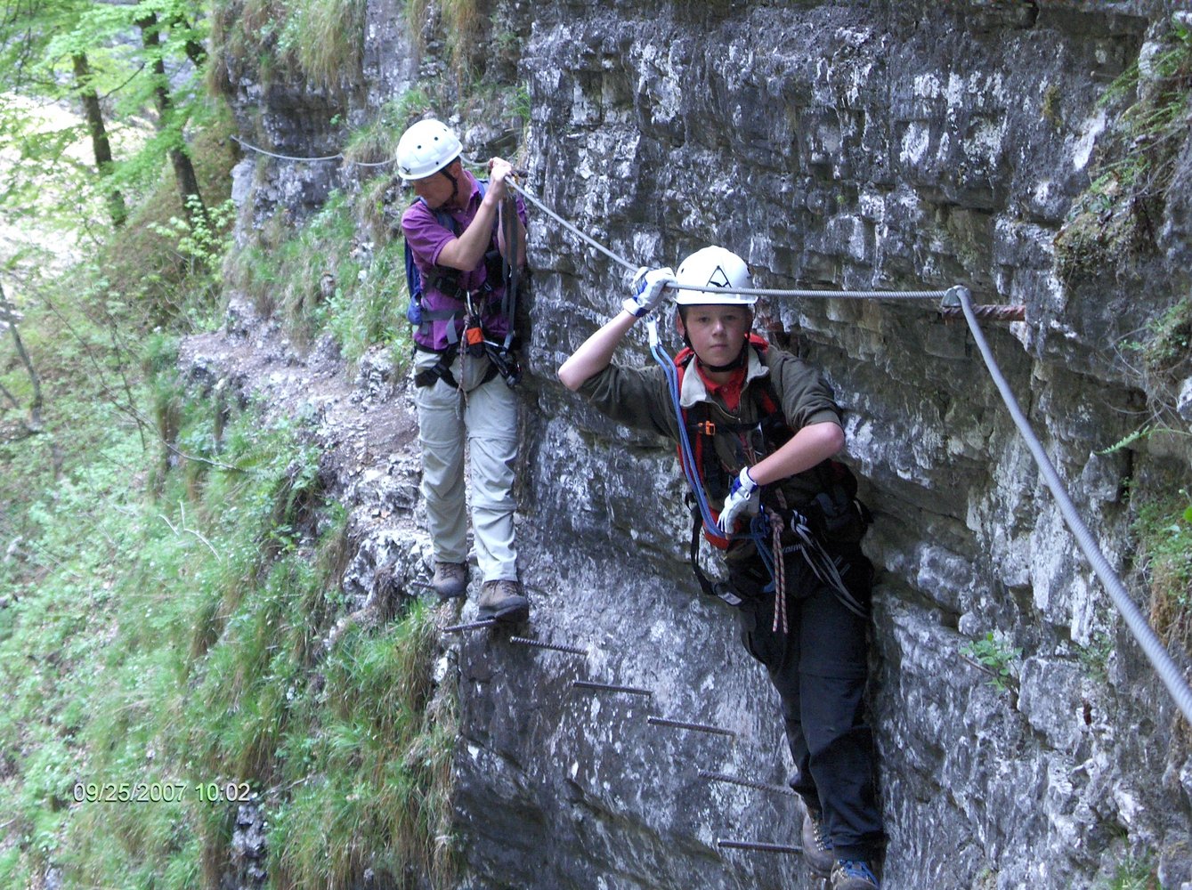 Bei Nässe ist die Klamm sehr rutschig und auch die heiklen Wiesen­pas­sagen sind kein Genuss! Selten wurde bei einem Klettersteig so viel Eisen in (durch) Bäume geschlagen. Die Wegführung wurde nach einem Sturmschaden gering­fügig geändert. Oben hat es früher noch eine kleine „Dschungelbrücke“ gegeben, diese wurde aber oft von umstürzenden Bäumen beschädigt und dann komplett abgebaut.  Siehe auch Klettersteig Brustwand (C) - beide Steige kann man gut kombinieren.