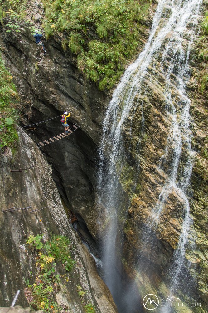 Klamm bis zur Wasserfallbrücke: Eine fallende Querung (A) zur ersten Brücke (Seufzerbrücke; B/C), danach durch steiles Waldgelände (Stelle B/C, meist leichter) zur zweiten Seilbrücke (Hangelbrücke; B/C). Dann weiter an sehr steilem Fels (bis B/C) zur engsten Stelle der Klamm und mit gewagtem "Gattsprung" (C) auf die andere Schluchtseite. Dann folgt ein glattes, meist nasses Wandstück (C) und über die nächste Seilbrücke (Wasserfallbrücke; B) gelangt man wieder auf die andere Seite der Klamm.
