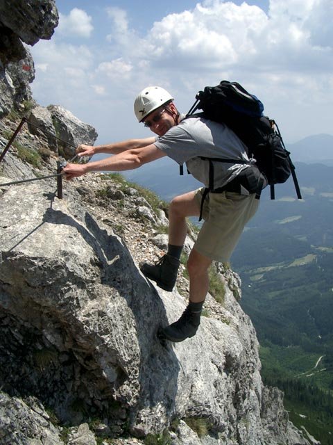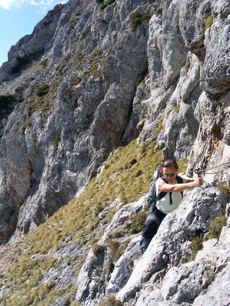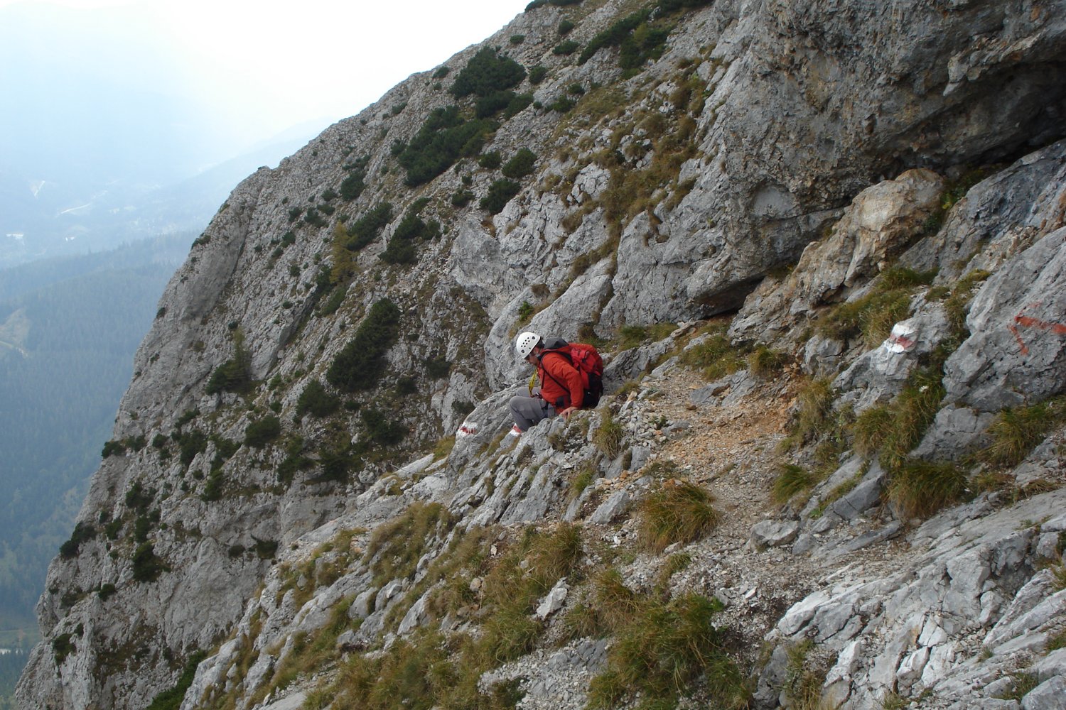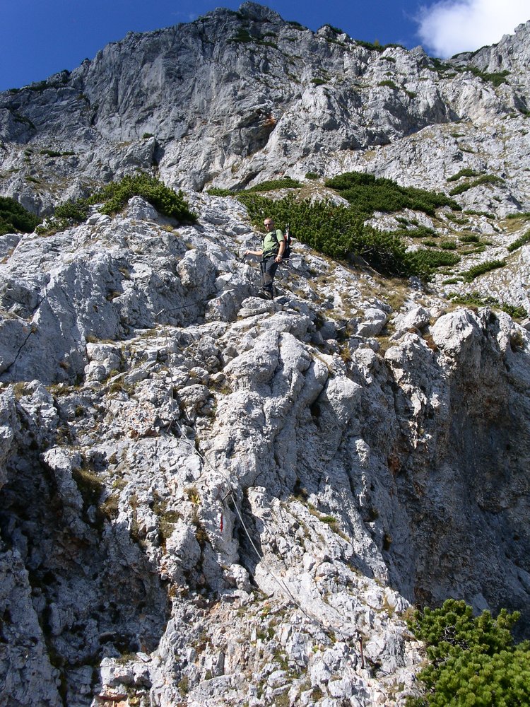 Über einen flachen Grat (A) ins Gehgelände. Es folgt eine etwas ausgesetzte, mit Stahlseil und Trittstiften versicherte Bandquerung (A/B) und eine Felsstufe (A). Weiter nach rechts queren und durch eine kaminartige, erdige Rinne zwischen Latschen aufs Plateau der Rax.