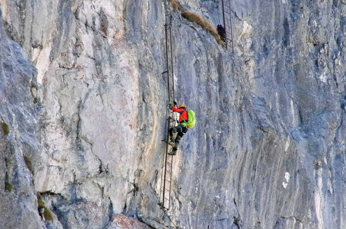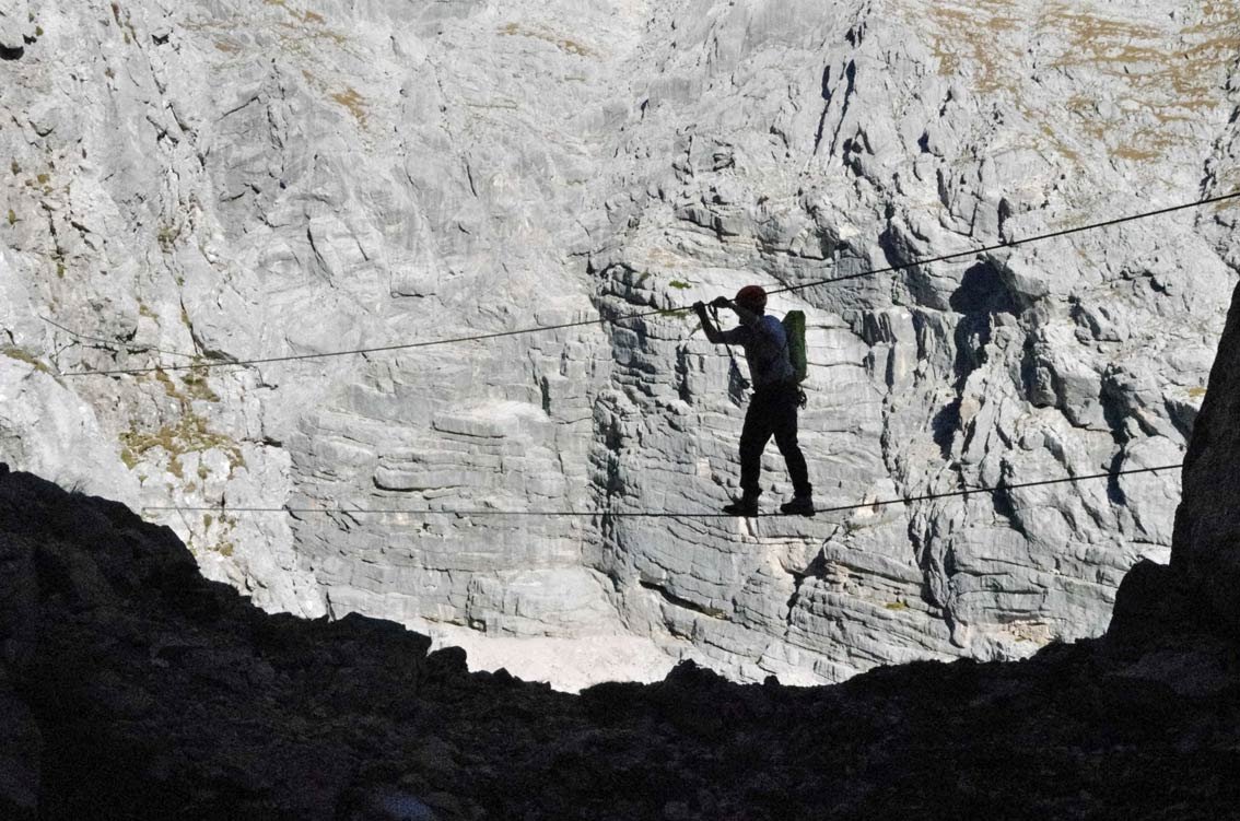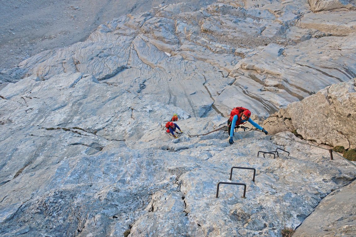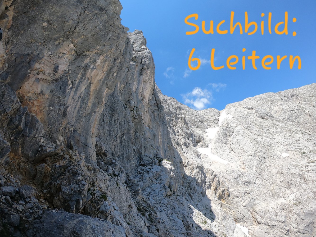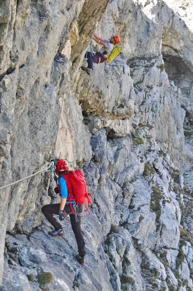 Die größten Schwierigkeiten gibt es im unteren Abschnitt. Am Affenschädel (kann man links umgehen) ist eine überhängende und trittarme D-Passage. An der Querung kommt ein Überhang (D). Die letzte D-Passage ist in der zweiten Höhle, man muss einen Spreizschritt machen und steil an der Südwestwand weiterklettern. Im oberen Wandteil klettert man sehr ausgesetzt und steil (kurz C/D, meist um C und B/C) an den beiden Steilstufen mit den vielen Leitern, naturgemäß packt man dort - den Abgrund unter sich wissend - etwas fester zu. Erst oben auf dem langen Südgrat wird das Gelände leichter.