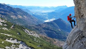 Wenn man 900 Hm am durchgehenden, 2130 m langen (!!!) Stahlseil hängt, sich dabei immer im oberen und mittleren Schwierigkeitsbereich bewegt, dann ist das Durchhaltevermögen fast bis zum Ende ausgereizt. Mit der Errichtung der langen und schwierigen Verbindung zwischen dem SO-Sporn-Klettersteig und Bert-Rinesch-Klettersteig wurde ein tolles „Gesamtwerk“ geschaffen, welches zu den Mega-Klettersteigen in Österreich gehört. Die lange Ferrata ist ein Mix aus Actionsteig (unten gibt es Seilbrücken, ausgesetzte Traversen und Höhlen) und langem alpinen Klettersteig mit Gipfelgrat. Das Stahlseil endet direkt beim mächtigen roten Gipfelkreuz des Gr. Priel, der höchsten Erhebung des Toten Gebirges - perfekter könnte man eine Klettersteigtour nicht abschließen!