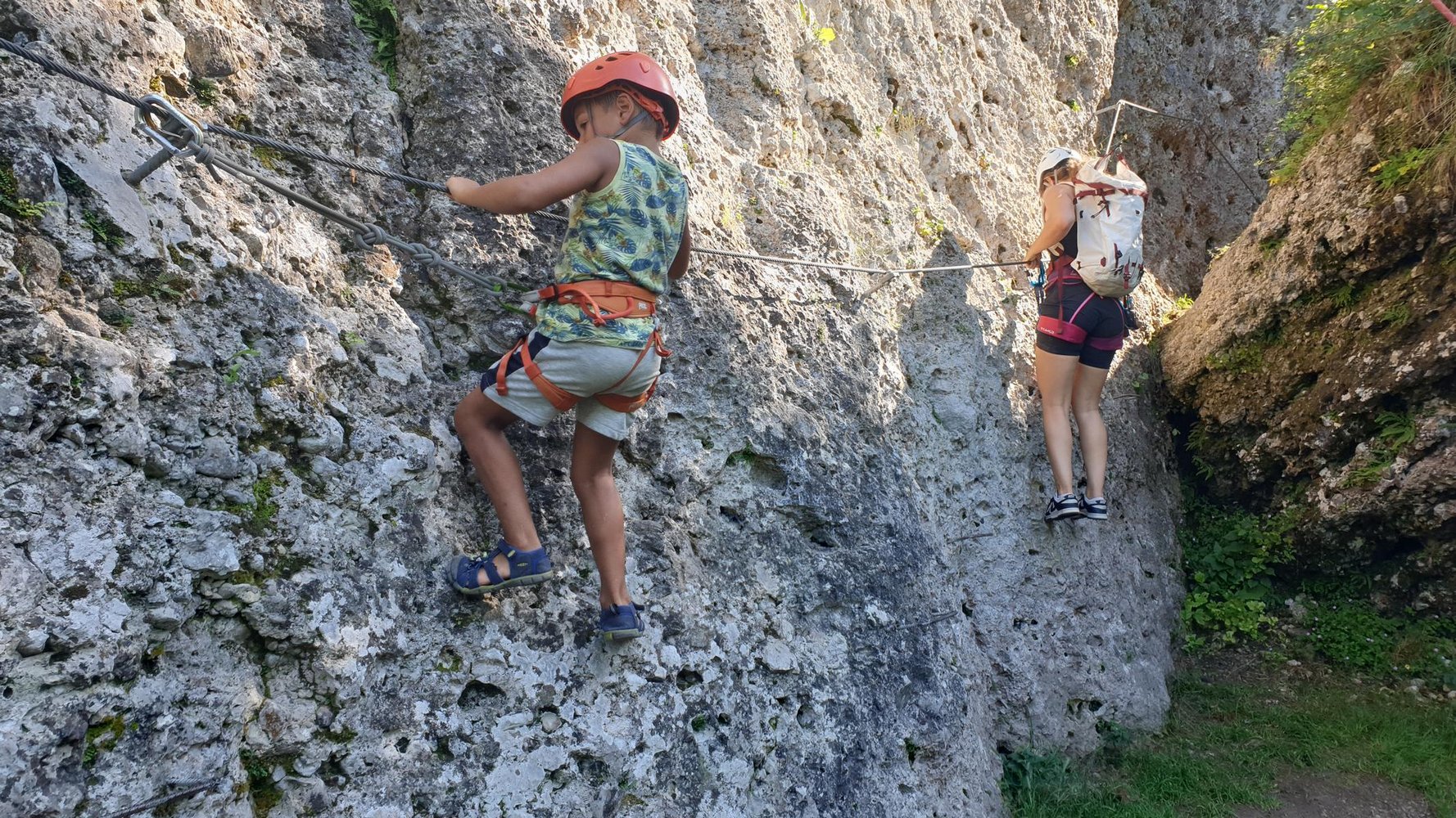Vom Ende des Drahtseils durch den Spalt und in wenigen Schritten nach rechts zum Einstieg zurück. Über den Zustiegsweg zum Parkplatz