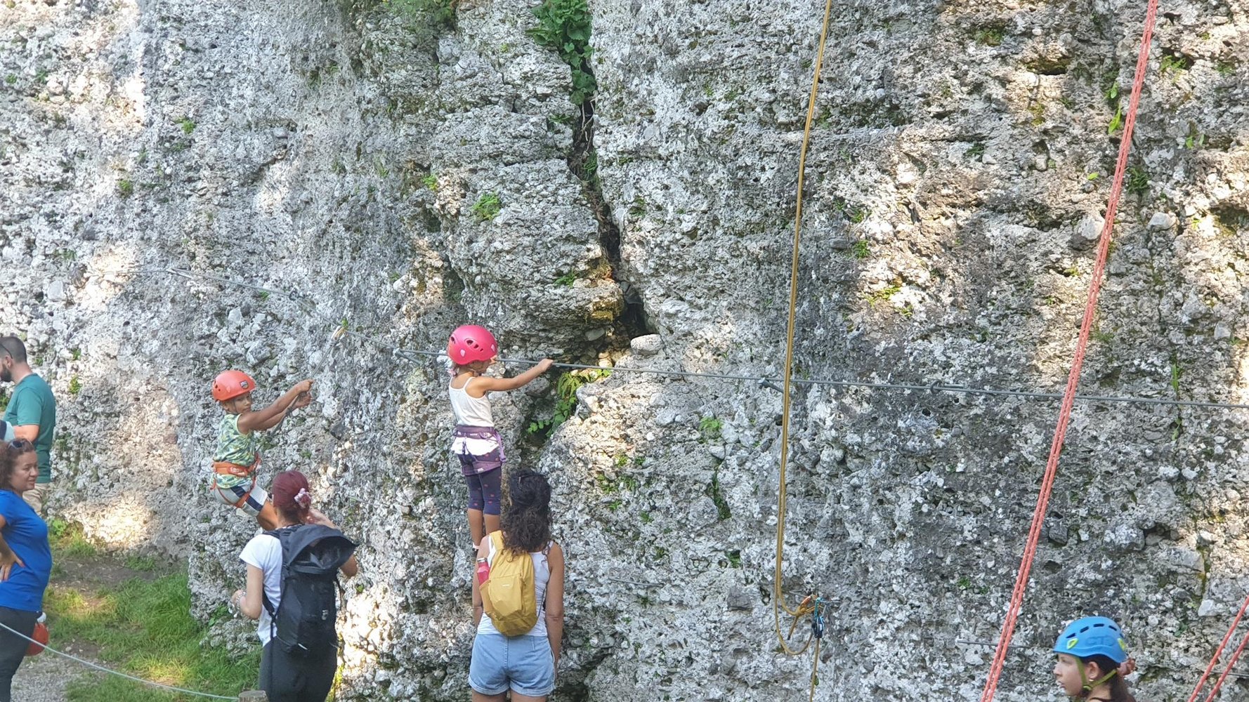 Kurzer Übungs-Klettersteig am Beginn des Klettergartens Promeghin. Der Klettersteig verläuft auf ca. 30 Meter immer nur ca. einen Meter über den Boden und ist somit perfekt für höhenängsliche Klettersteiggeher und Kinder. Im Sommer bis in den späten Nachmittag hinein im Schatten.