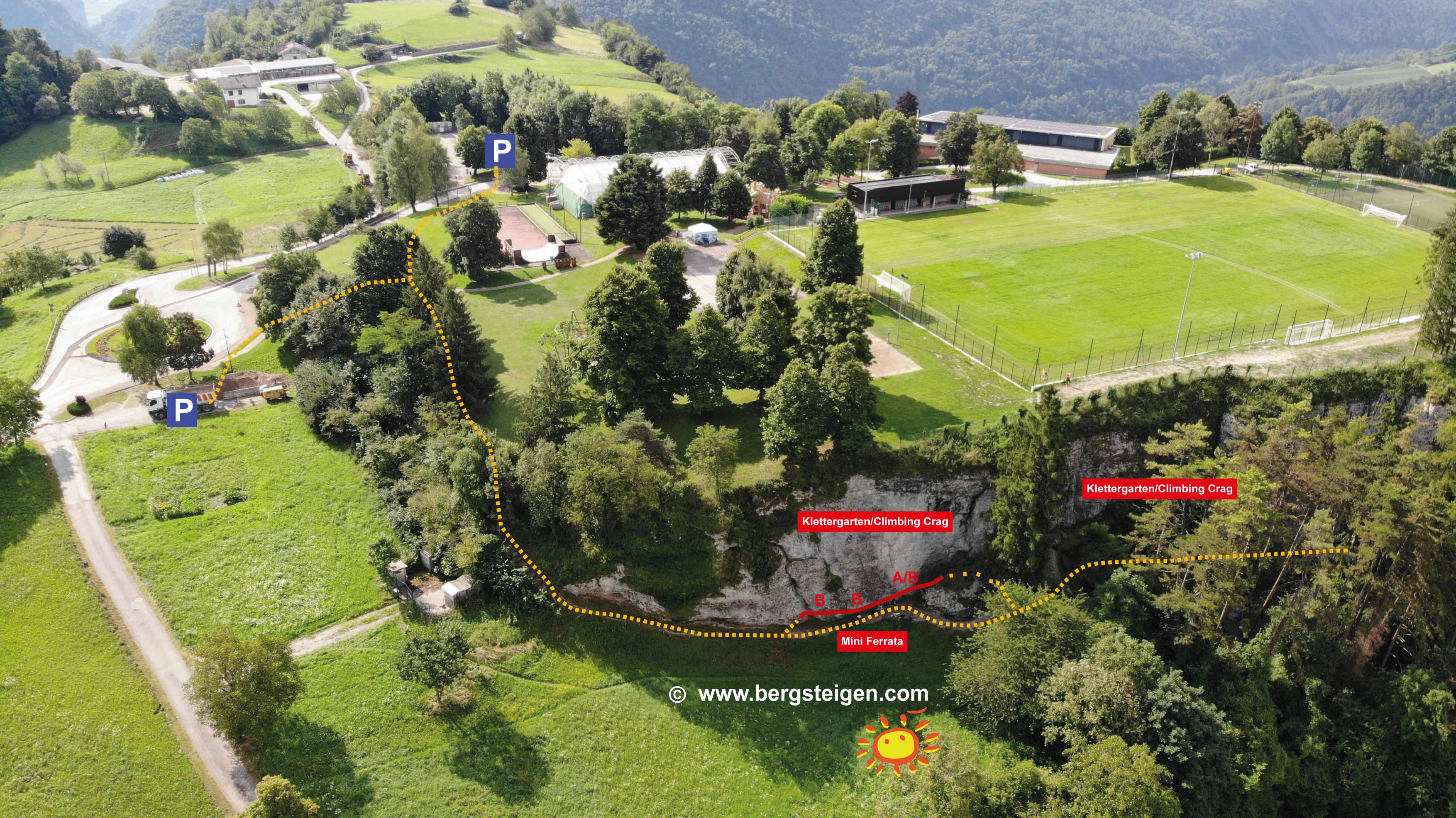 Vom Parkplatz in die Sportanlage zum Spielplatz und unter (nördlich) dem Fussball-/Beach Volleyballplatz nach Westen bis vor dem Zaun ein kleines Holzschild zu den Stufen weist, die zum Klettergarten hinunter führen. Gleich am Beginn des Klettergartens Promeghin trifft man auf den Klettersteig.