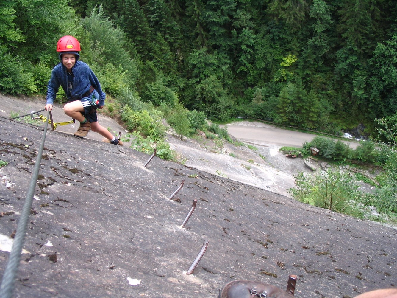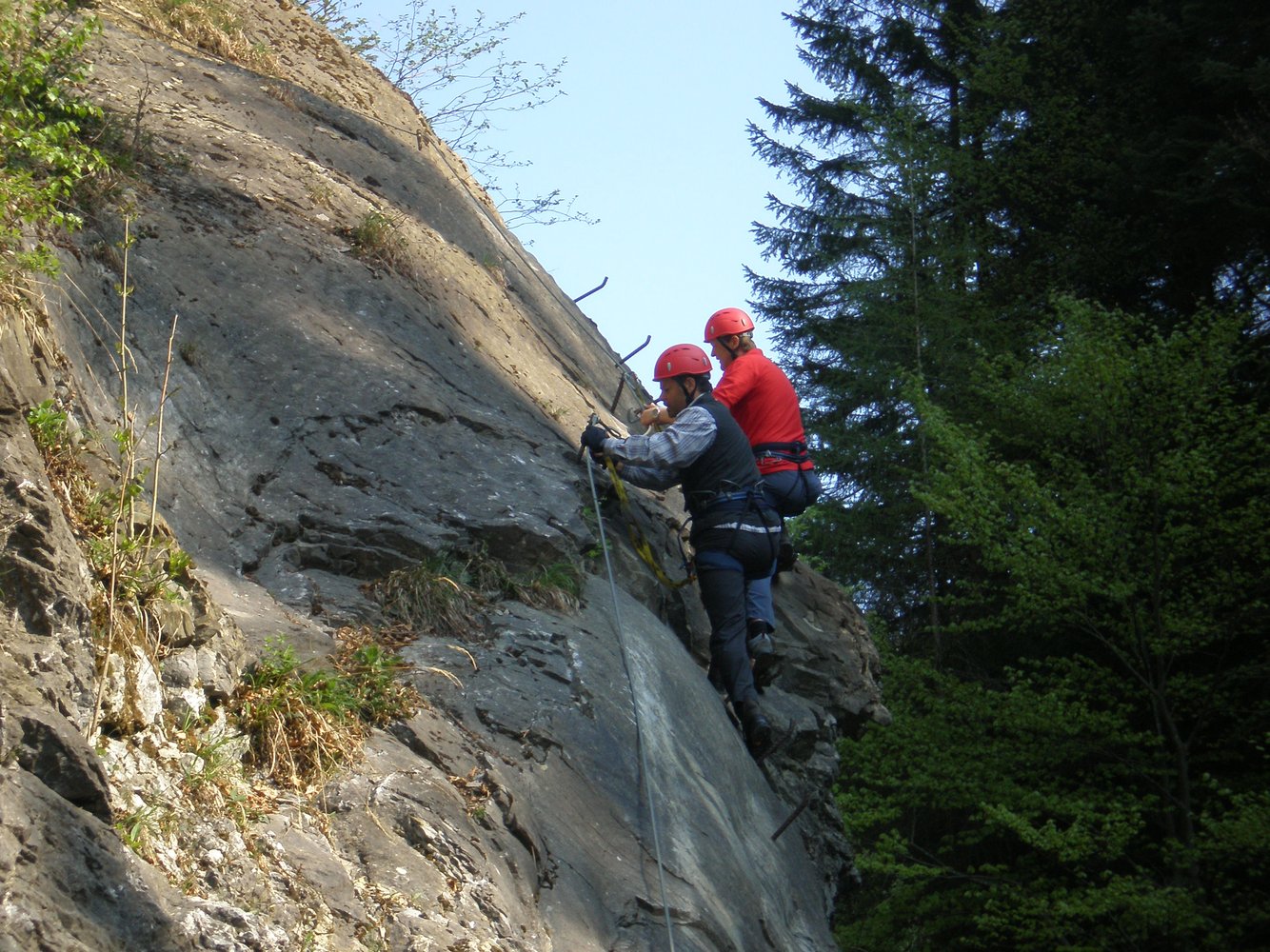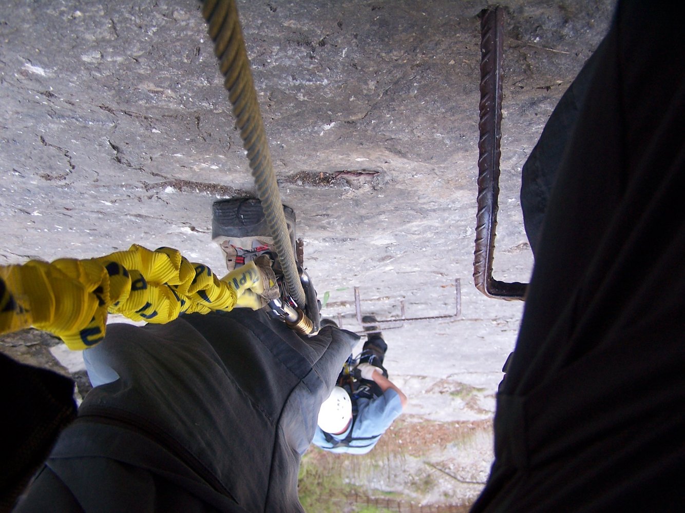 Wenn sich im darunter liegenden Klettergarten Leute befinden, bitte um besondere Vorsicht, da auf den Bändern oft lose Steine liegen.