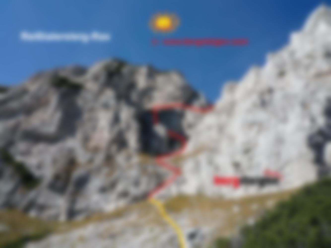 Bei großem gelben Pfeil über die Einstiegsplatte hinweg und in einer Schleife zur Eisenleiter. Danach Gehgelände, leicht rechts zu markantem Block mit Kreuz (Steigbuch), um diesen links herum den Steigspuren zum Raxplateau folgen. Es kann in der Höhe des Steigbuches auch zum Gretchensteig bzw. Karl-Ludwig-Haus gequert werden. Auf dem Raxplateau angelangt sind es noch ca. 20 bis 30 min zur Heukuppe 2007 m.